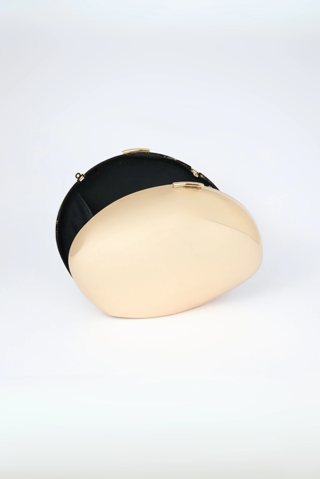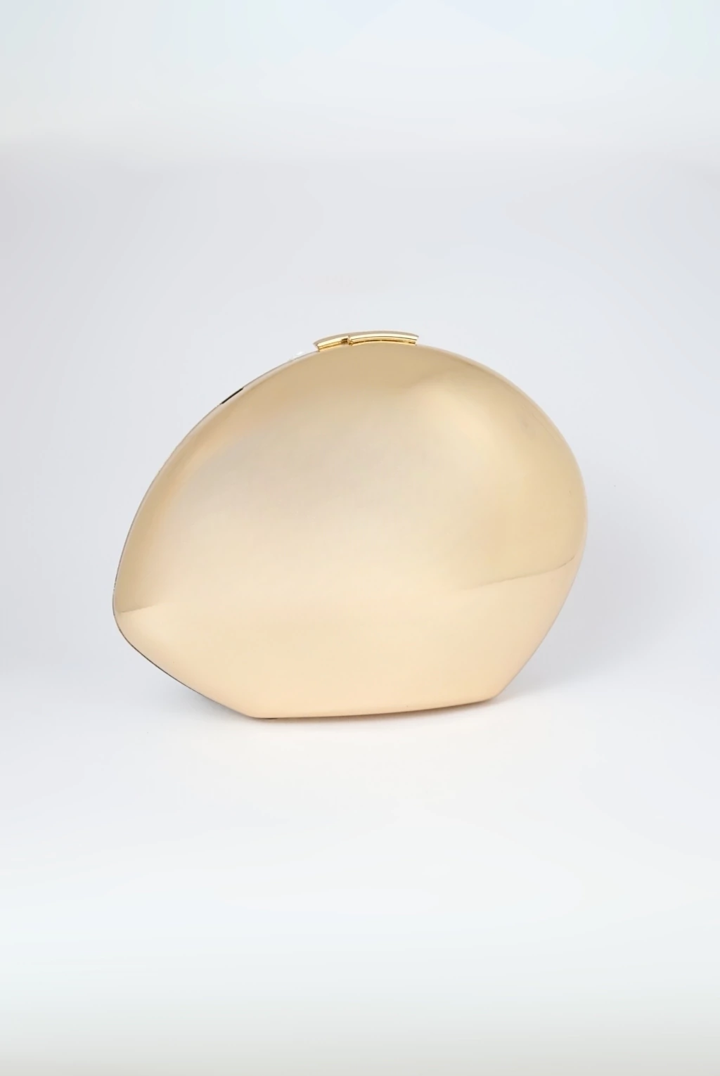 Bolsa clutch oval, espelhada na cor dourada, feita de acrílico de alta qualidade, alça de ombro removível em corrente e parte interna forrada.