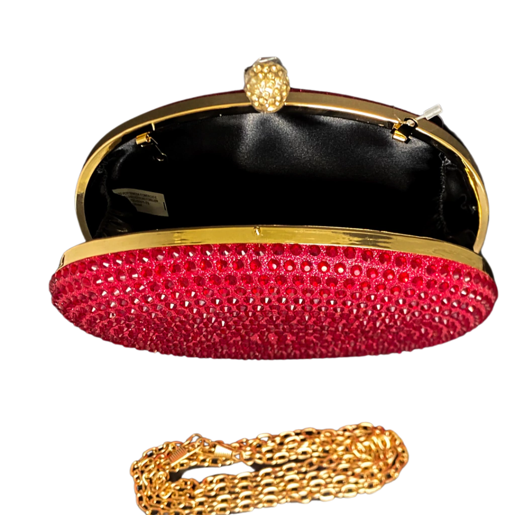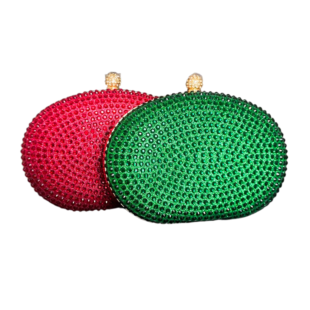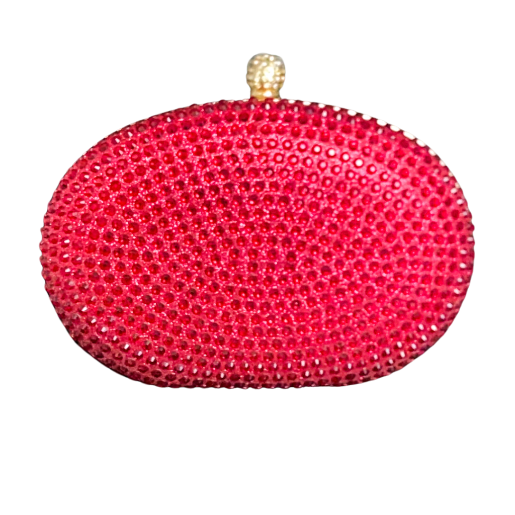 Bolsa clutch redonda em pedraria, com fecho dourado.