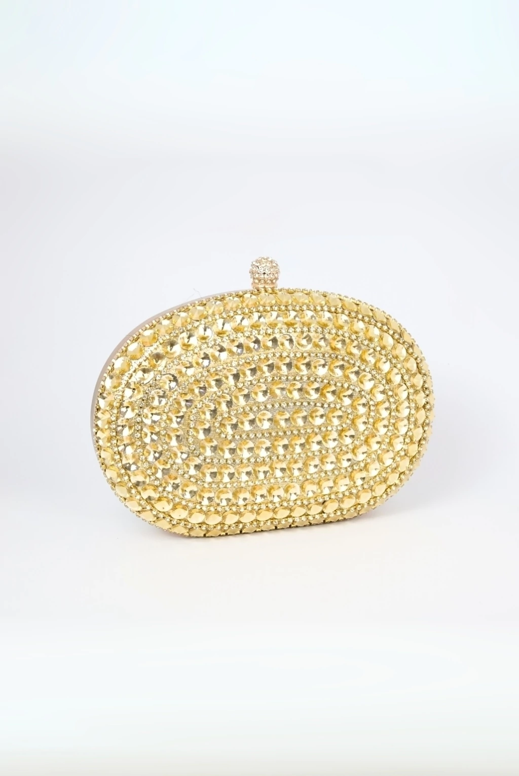 Bolsa Clutch oval prateada e com pedras brilhantes - Dourado
