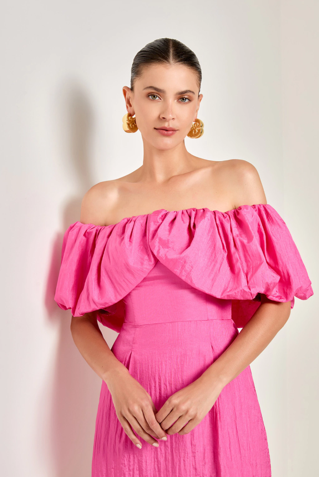 Vestido de tafetá com modelagem sem alça e decote bufante, que adiciona volume na parte superior, seguindo a tendência atual de peças com detalhes volumosos. A peça possui uma silhueta ajustada ao corpo com comprimento curto, destacando-se pelo caimento estruturado do tecido. Ideal para eventos que pedem um look moderno e marcante.