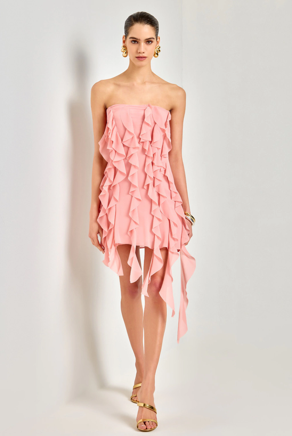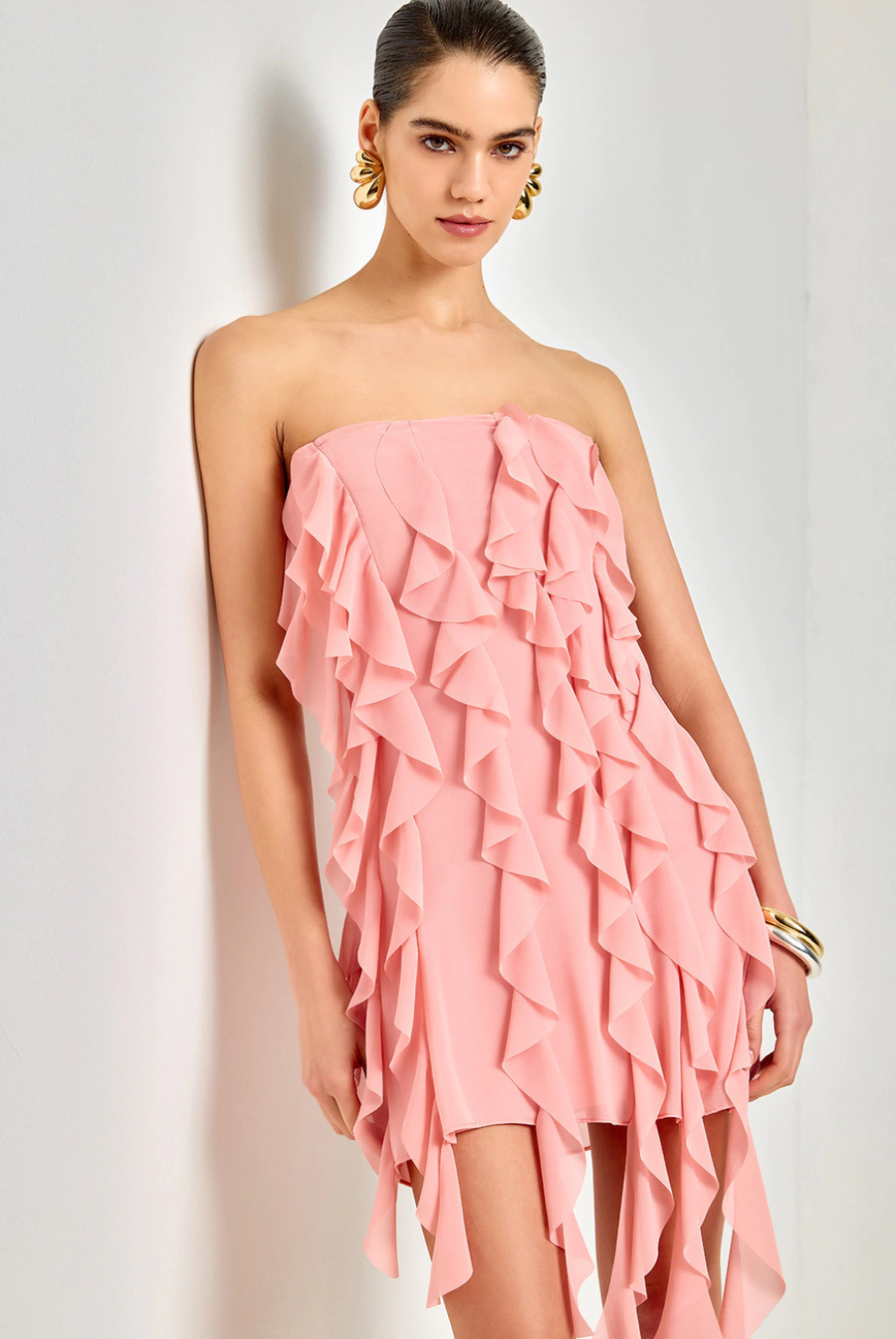 Este vestido de chiffon, sem alças, possui um design encantador e fluido, perfeito para diversas ocasiões. O modelo é estruturado no busto e apresenta uma série de babados verticais que criam movimento e leveza. Com um comprimento assimétrico dos babados, proporciona um toque moderno e elegante. Ideal para eventos formais ou festas, este vestido se destaca pela sua elegância sutil e design sofisticado.