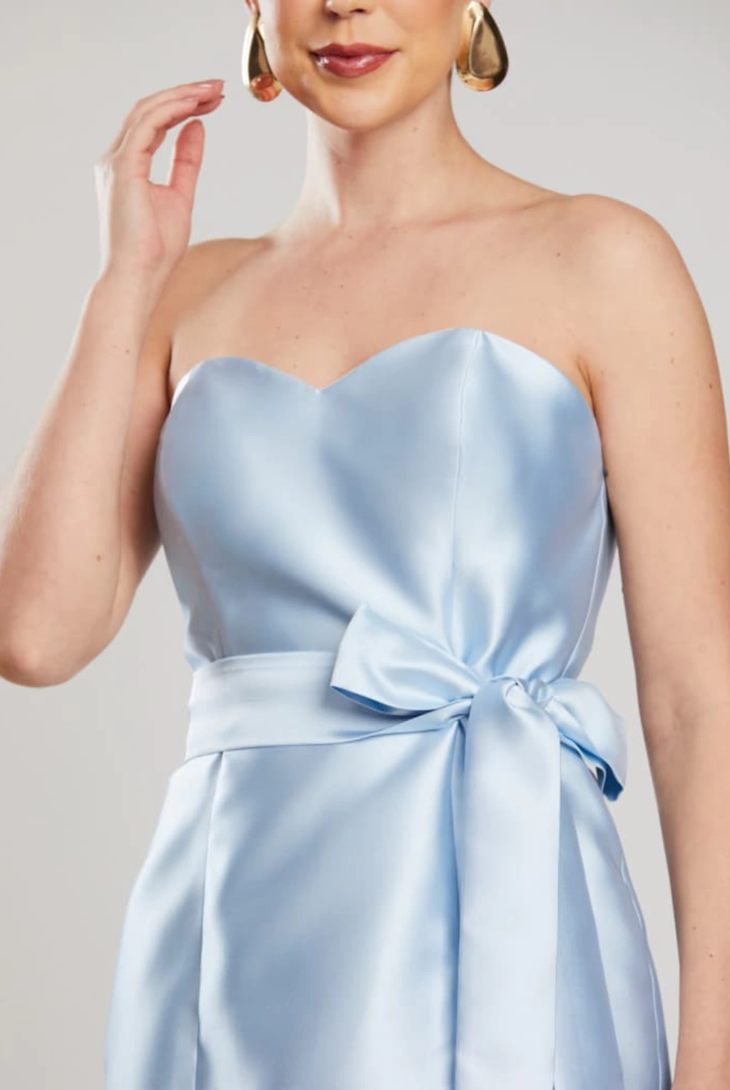 Vestido de festa curto, tomara que caia decote coração e laço fixo - Azul Serenity