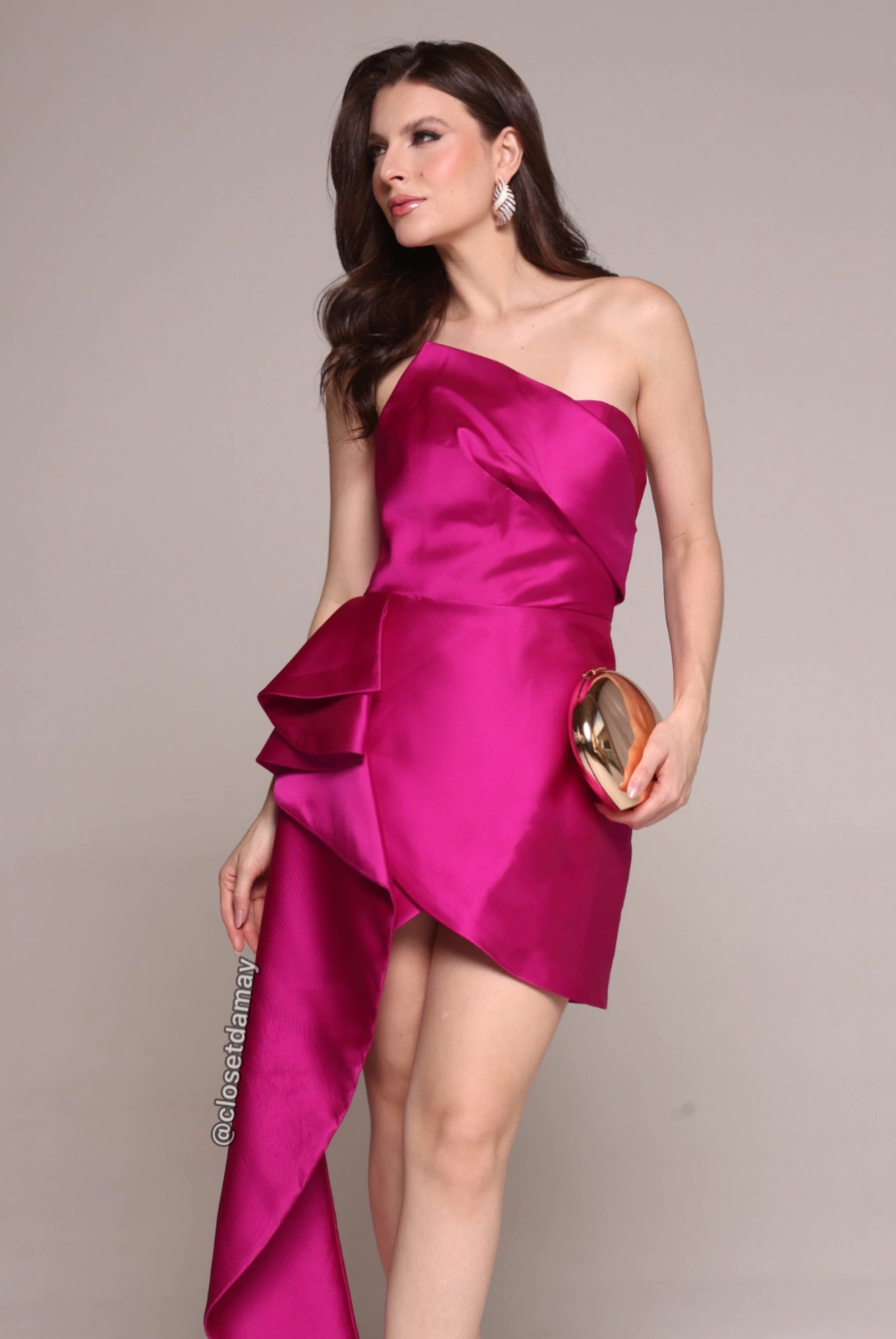 Vestido de festa curto, tomara que caia, em zibeline, com babados assimétricos. Possui bojo, forro e zíper.