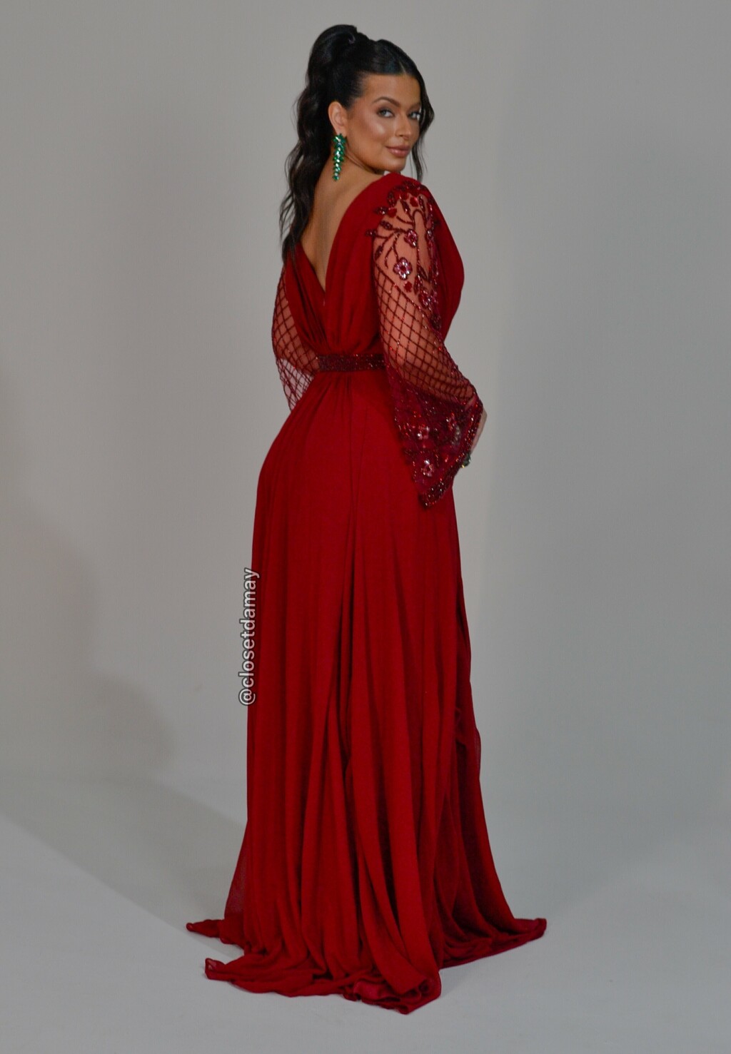 Vestido de festa longo em crepe de seda com manga longa bordado, saia fluida. Possui bojo, forro e zíper.