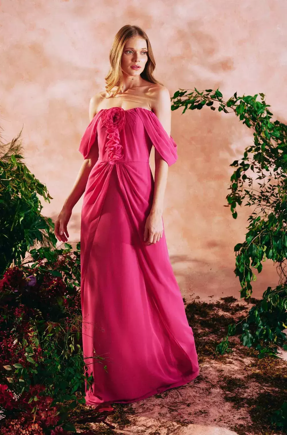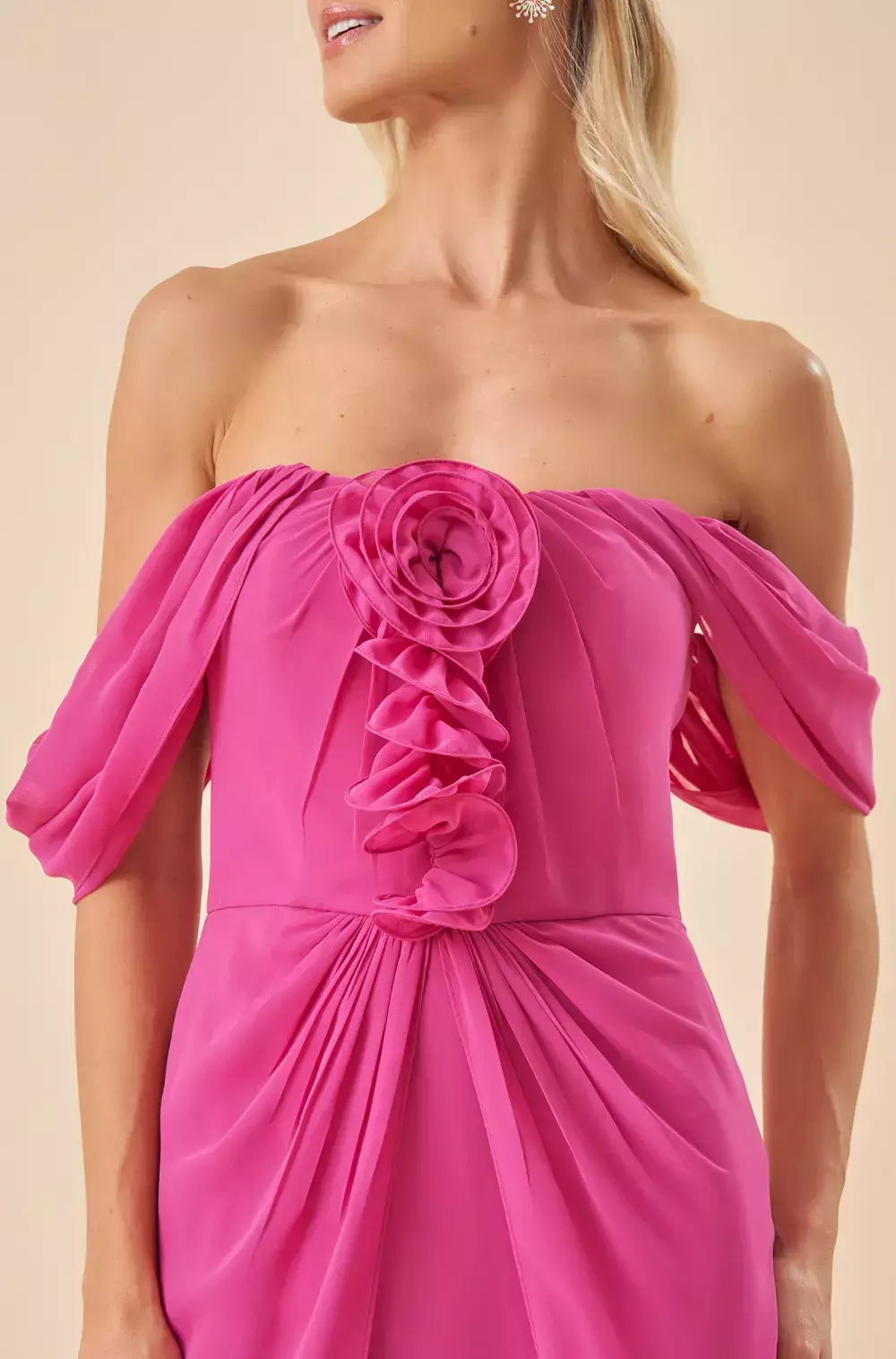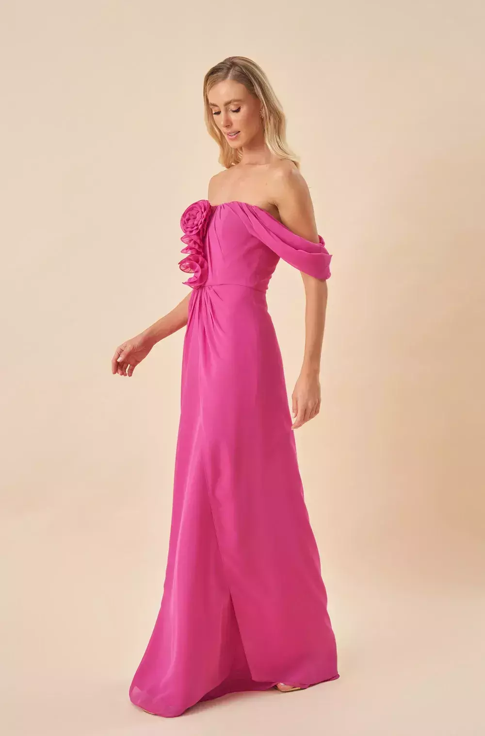 Vestido de festa longo, em chiffon, tomara que caia com manga degagê, busto estruturado, e aplicação de flor. Possui bojo. forro e zíper.
