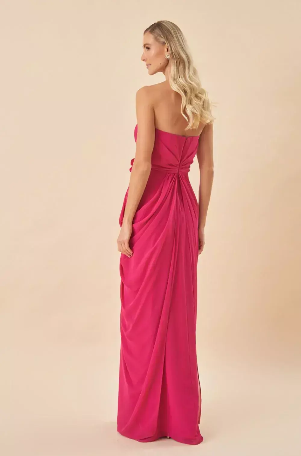 Vestido de festa longo, em chiffon, tomara que caia com saia reta degagê, busto estruturado, e aplicação de flor. Possui bojo. forro e zíper.
