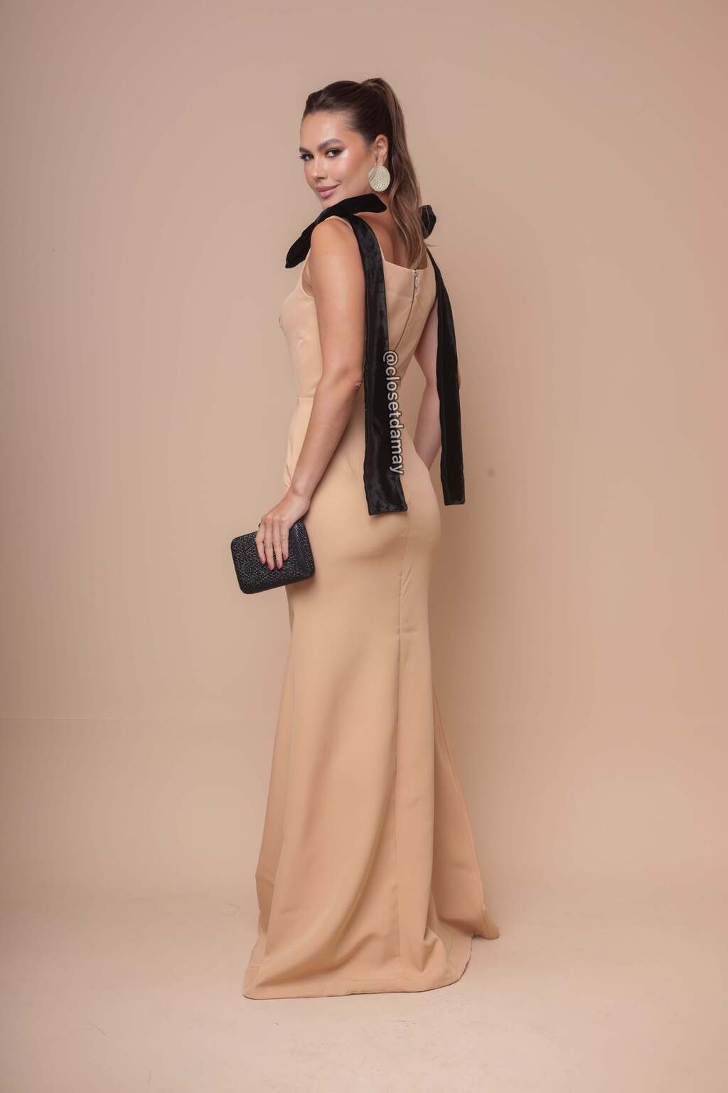 Vestido de festa longo, com modelagem sereia, base bege simples, decote quadrado e destaque para os maxi laços de veludo que caem com as pontas para trás do vestido.