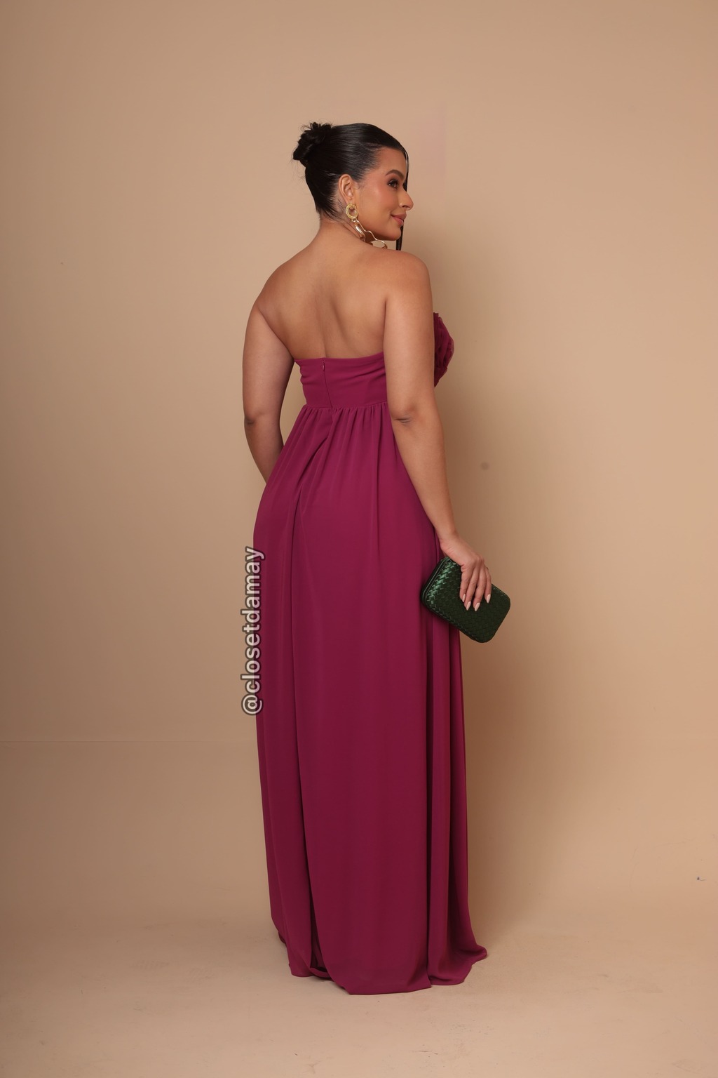 Vestido de festa longo, modelagem reta e flúida. leve franzido e destaque para a aplicação de flor em babados no busto.