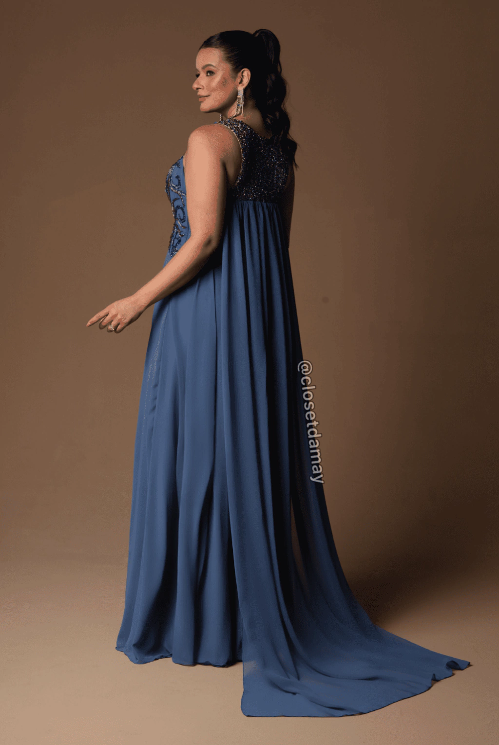 Vestido de festa longo, sem mangas, com alças largas, saia fluida e busto bordado em pedraria. Perfeito para ocasiões que exigem elegância e glamour.
