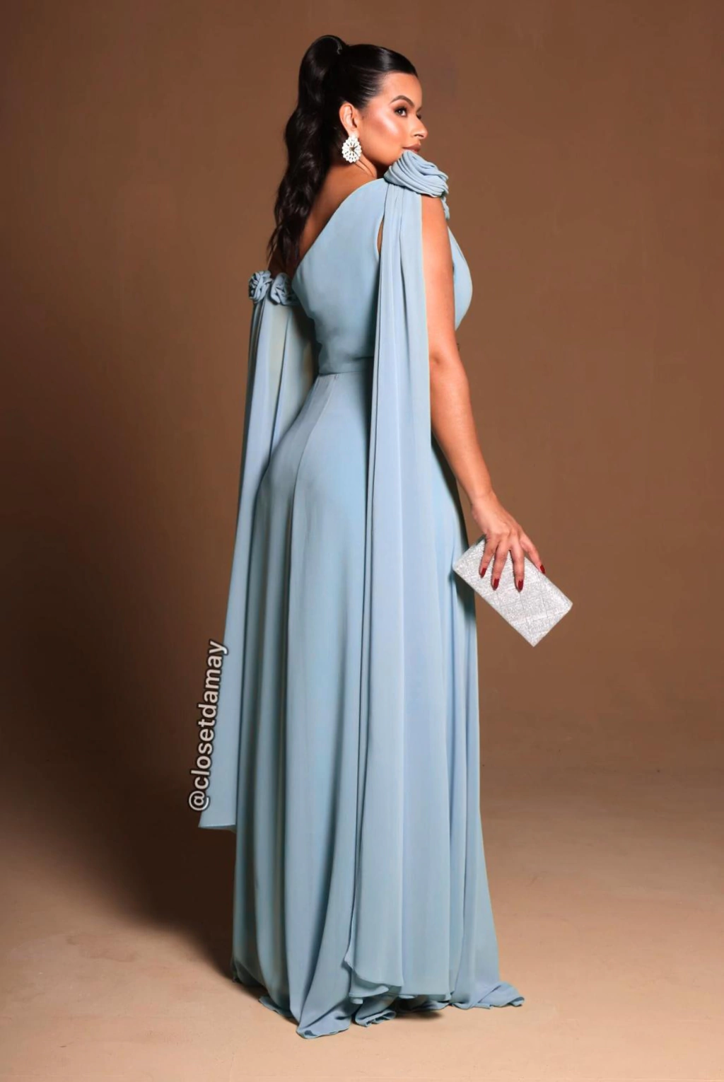 Vestido de festa longo, decote assimétrico, com capa e saia fluida. Possui bojo, forro e zíper.