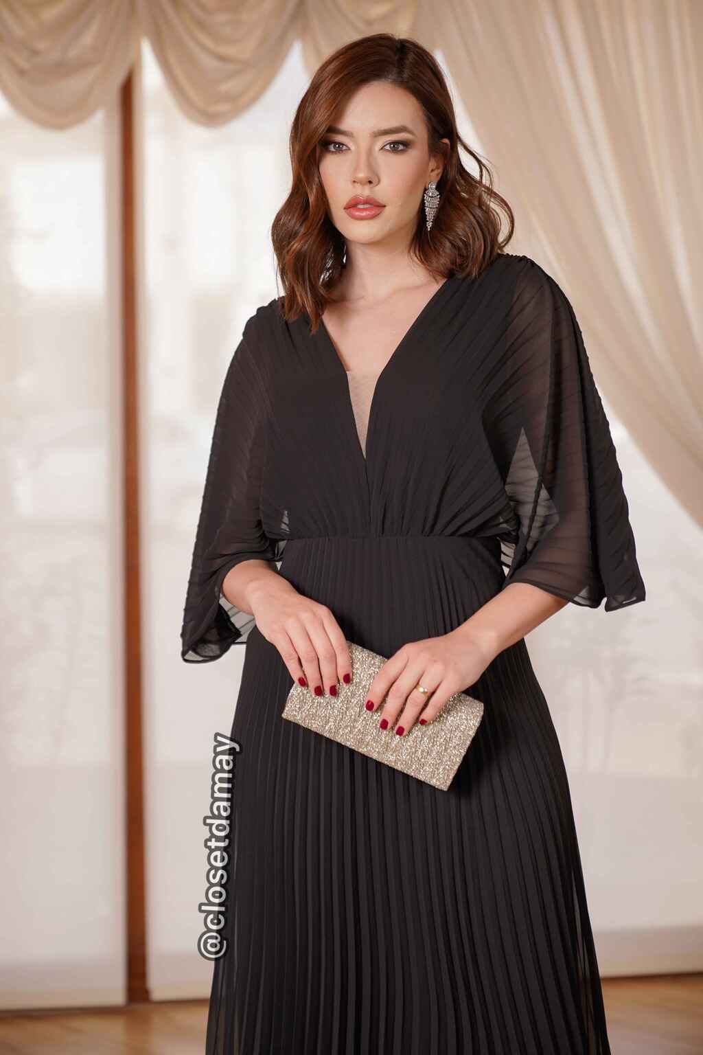 Vestido longo, em crepe de seda plissado, com capa, manga morcego, decote v com transparencia no tule e saia fluida. Possui bojo, forro e zíper.