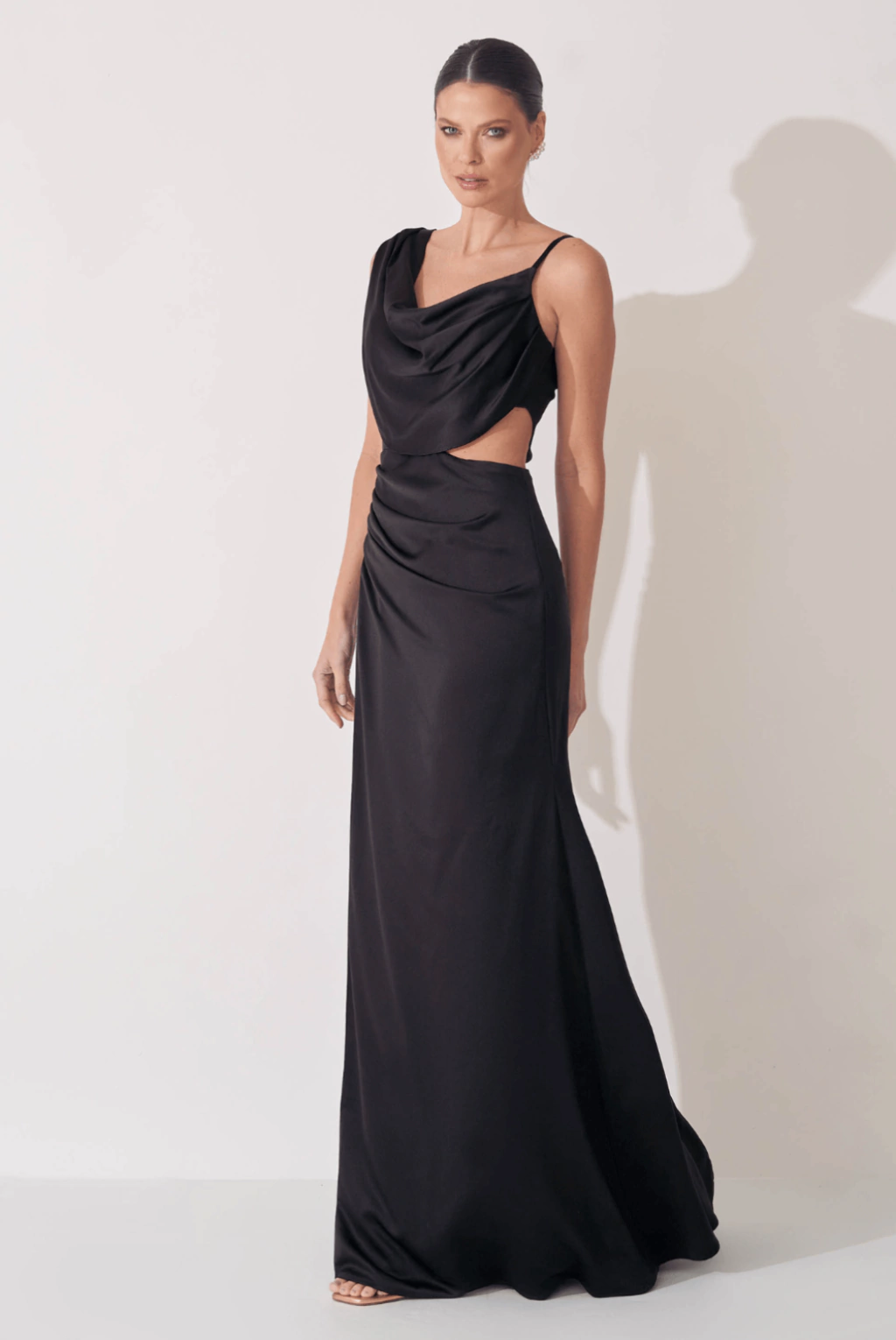Vestido de festa longo, com decote assimétrico, saia transpassada com fenda frontal - Preto