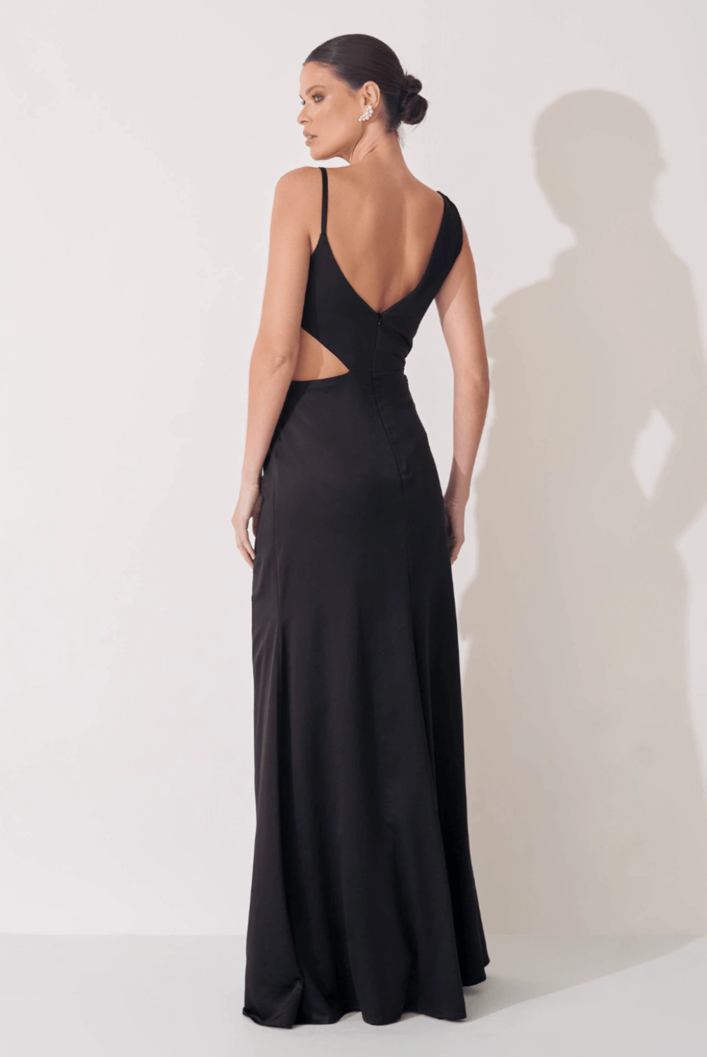 Vestido de festa longo, com decote assimétrico, saia transpassada com fenda frontal - Preto