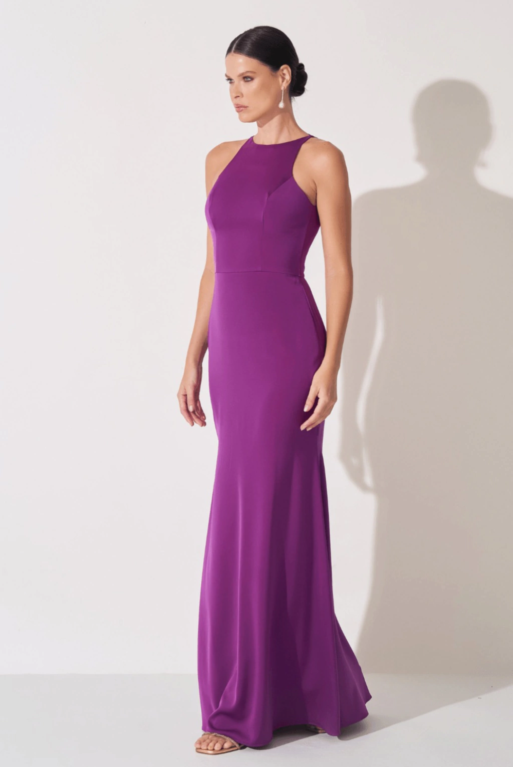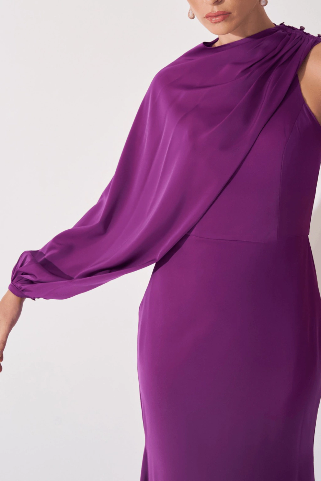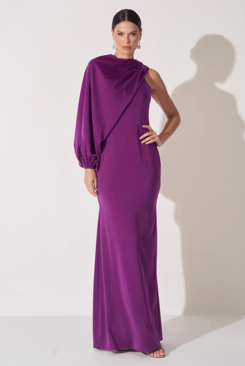 Vestido de festa longo, com decote canoa e alça larga, manga bulfante removível assimétrica e saia reta que proporciona um caimento impecável, valorizando o corpo e trazendo leveza a peça.