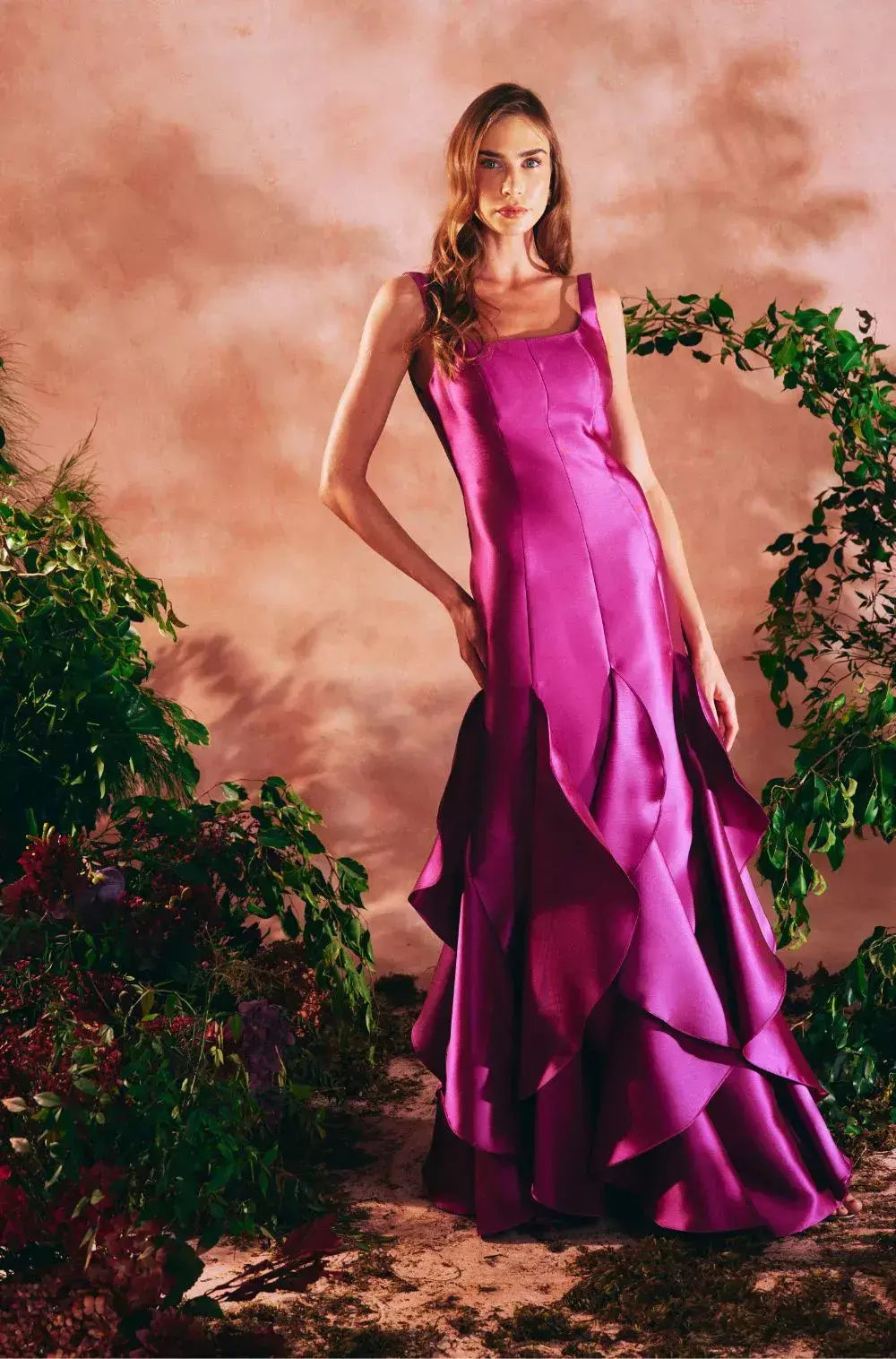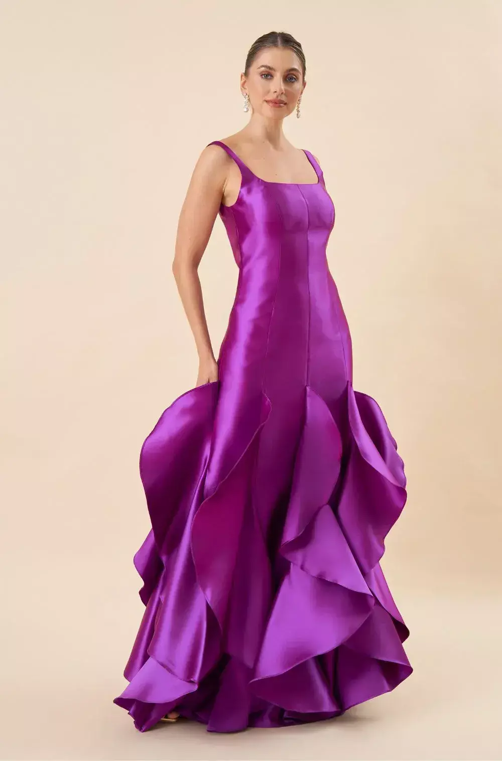 Vestido de festa longo sereia, em zibeline, decote quadrado, alças largas e aplicação de babados vesticais. Possui bojo, forro e zíper.