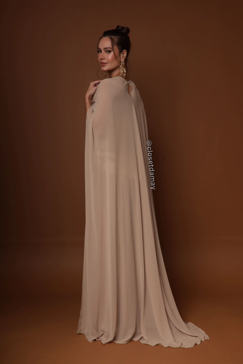 Vestido de festa longo, com decote reto e capa fixa - Dourado