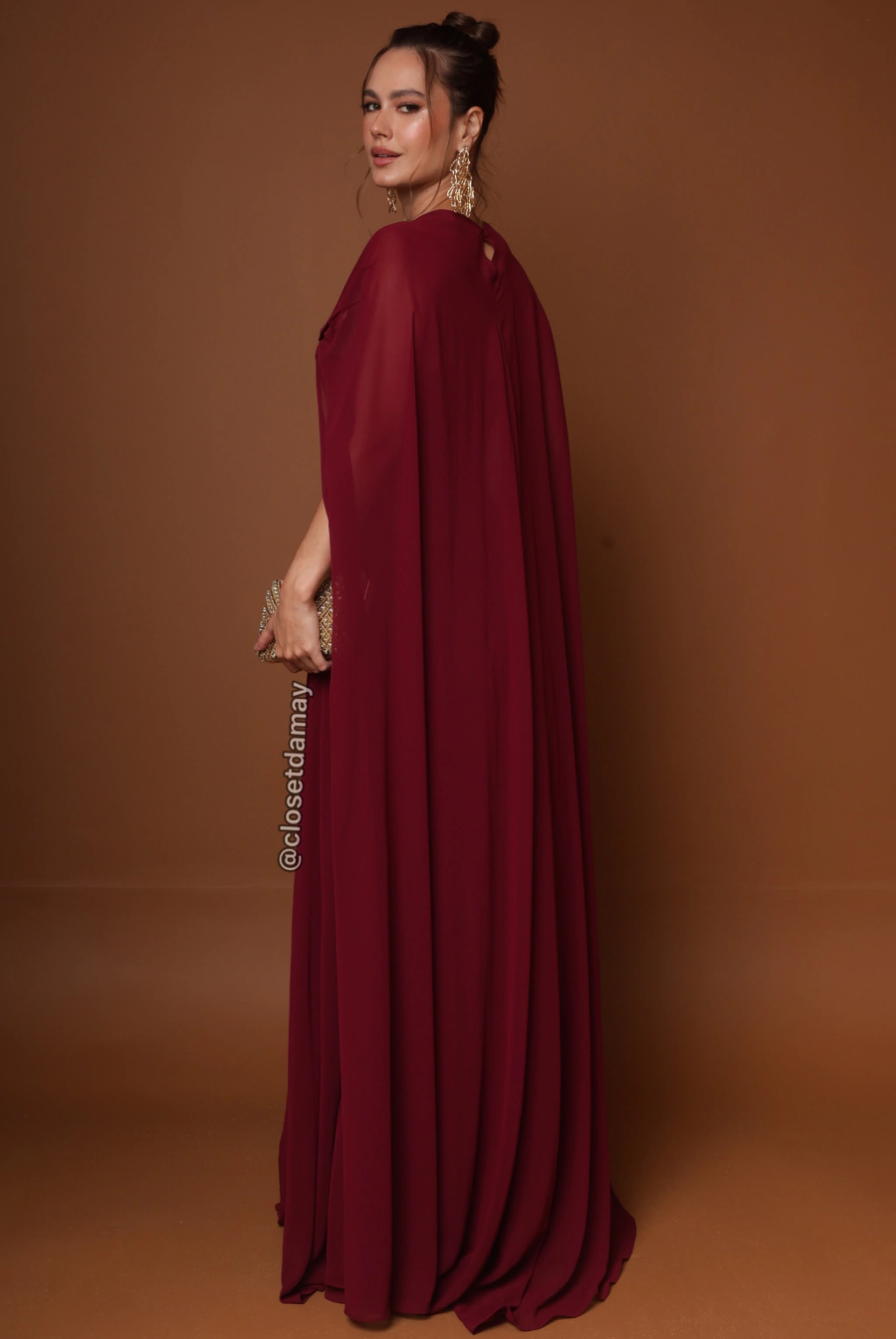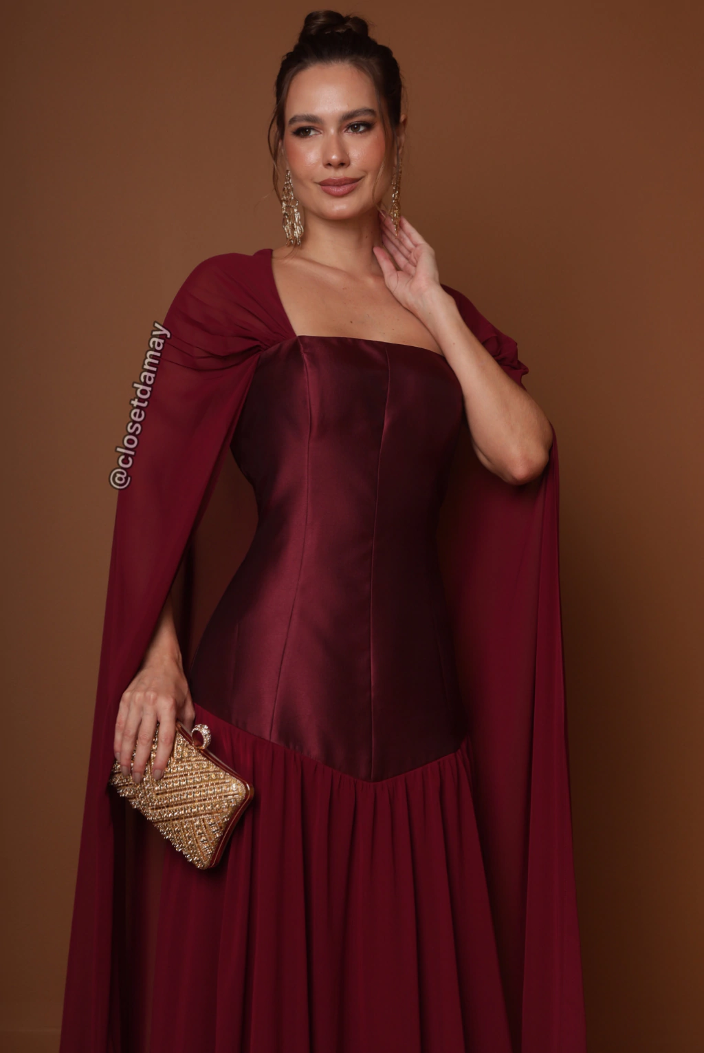 Vestido de festa longo marsala com capa, tomara que caia, modelagem sereia com aplicação de capa de crepe de seda. Possui zíper.
