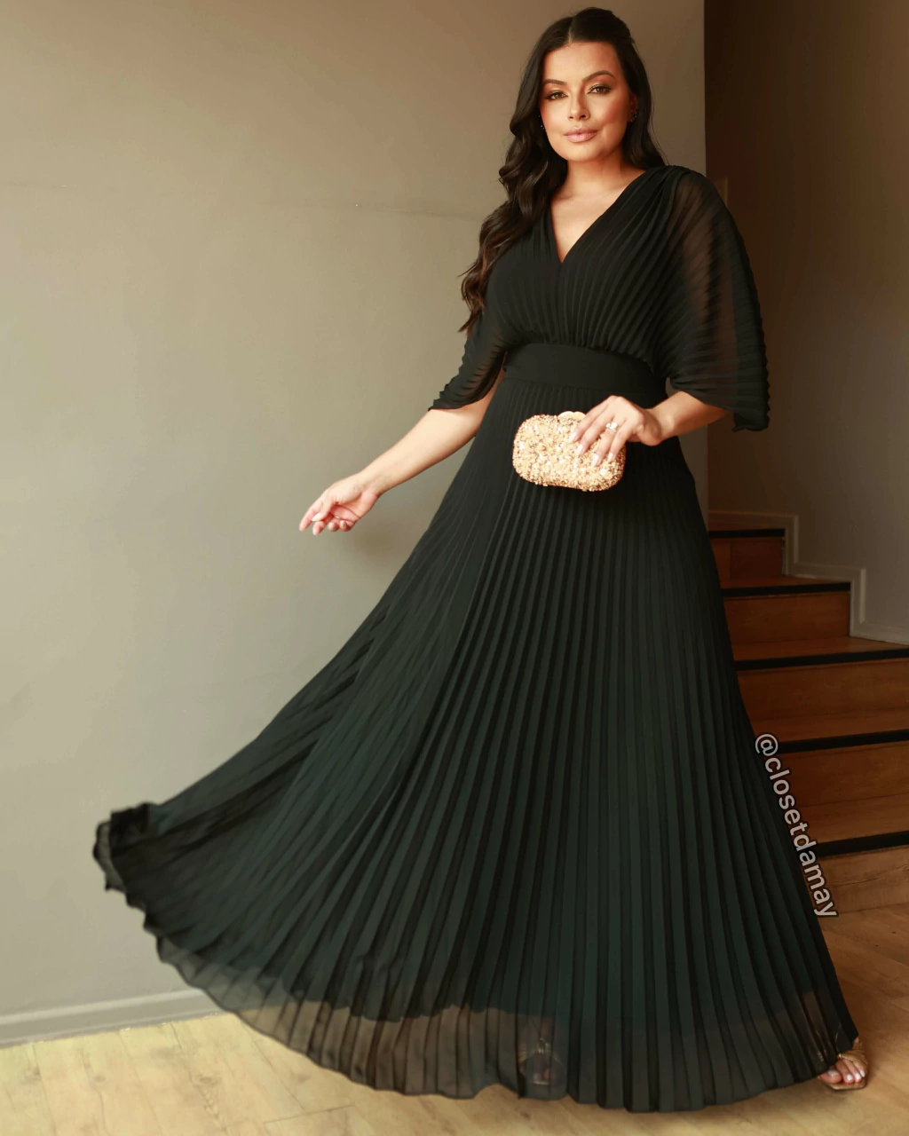 Vestido longo, tecido em crepe de seda plissado,com decote em v, proporciona um caimento impecável, valorizando o corpo e trazendo leveza a peça.