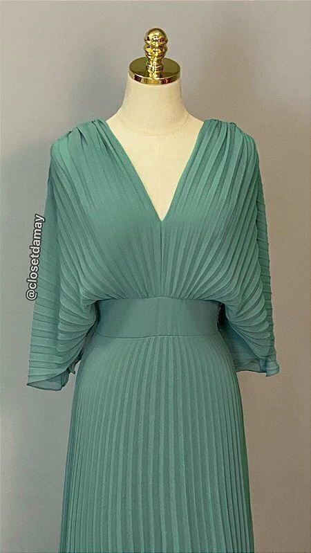 Vestido longo, tecido em crepe de seda plissado, com decote em v, proporciona um caimento impecável, valorizando o corpo e trazendo leveza a peça.