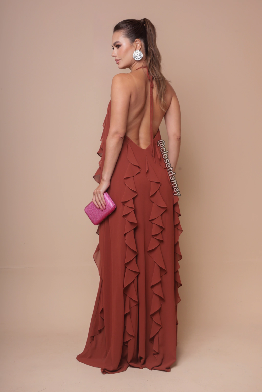 Vestido de festa longo, em crepe de seda, frente única, com babados na saia e no busto, aplicação de flor, proporcionando caimento e leveza. Possui forro, bojo e zíper invisível.