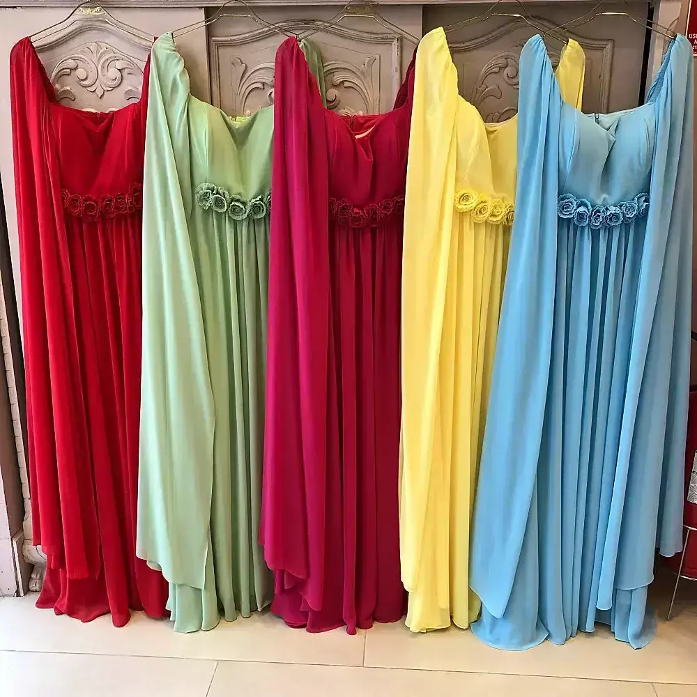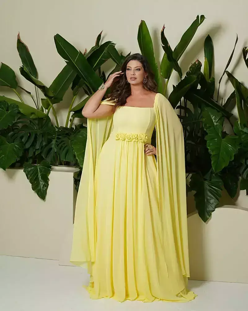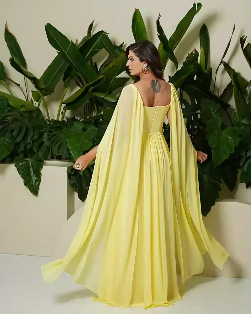 Vestido de festa longo em chiffon, com manga capa, com aplicação de flor na cintura e saia fluida. Possui bojo, forro e zíper.