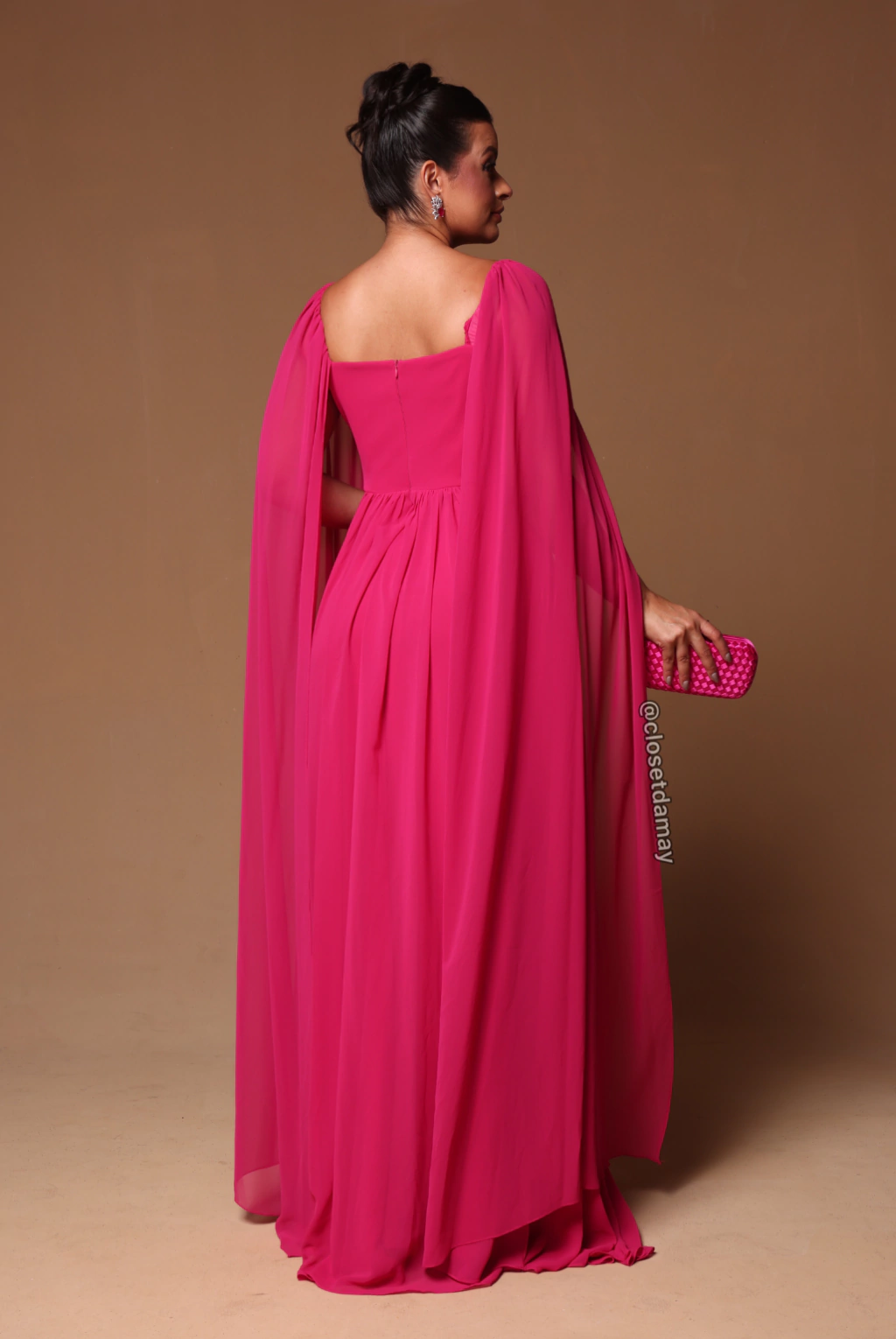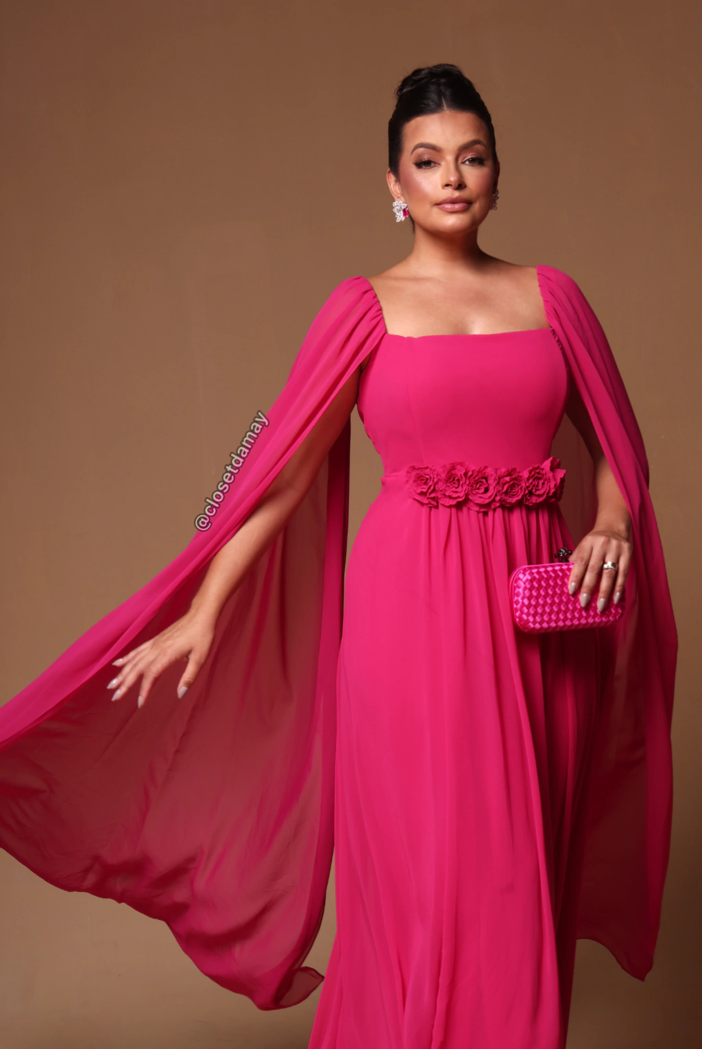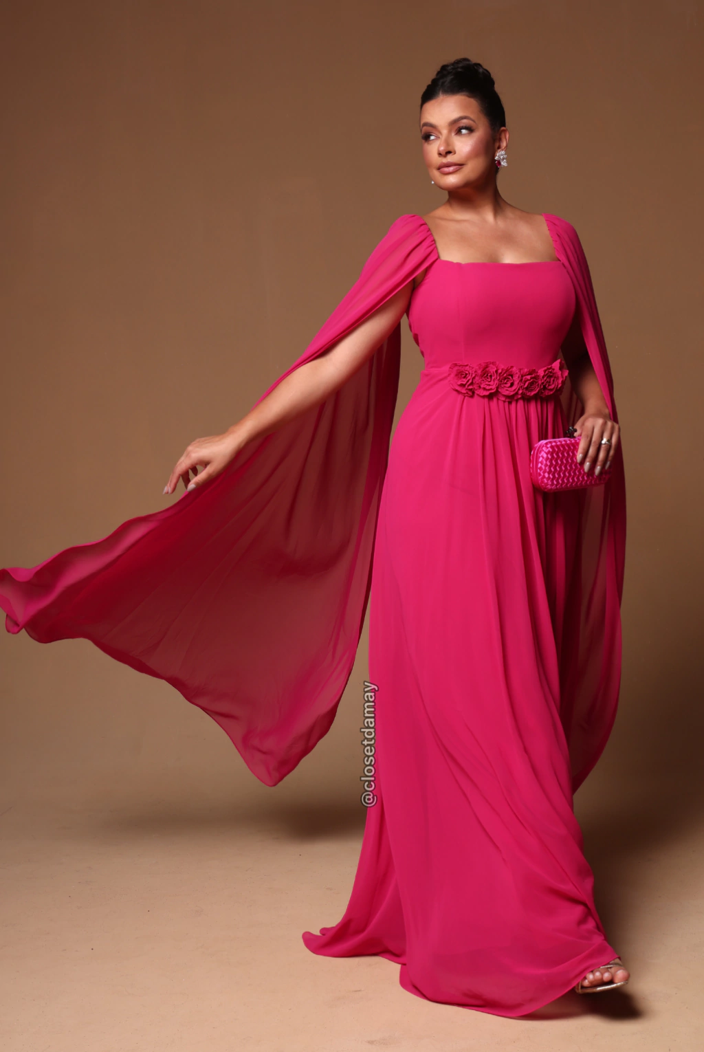 Vestido de festa longo em chiffon, com manga capa, com aplicação de flor na cintura e saia fluida. Possui bojo, forro e zíper.