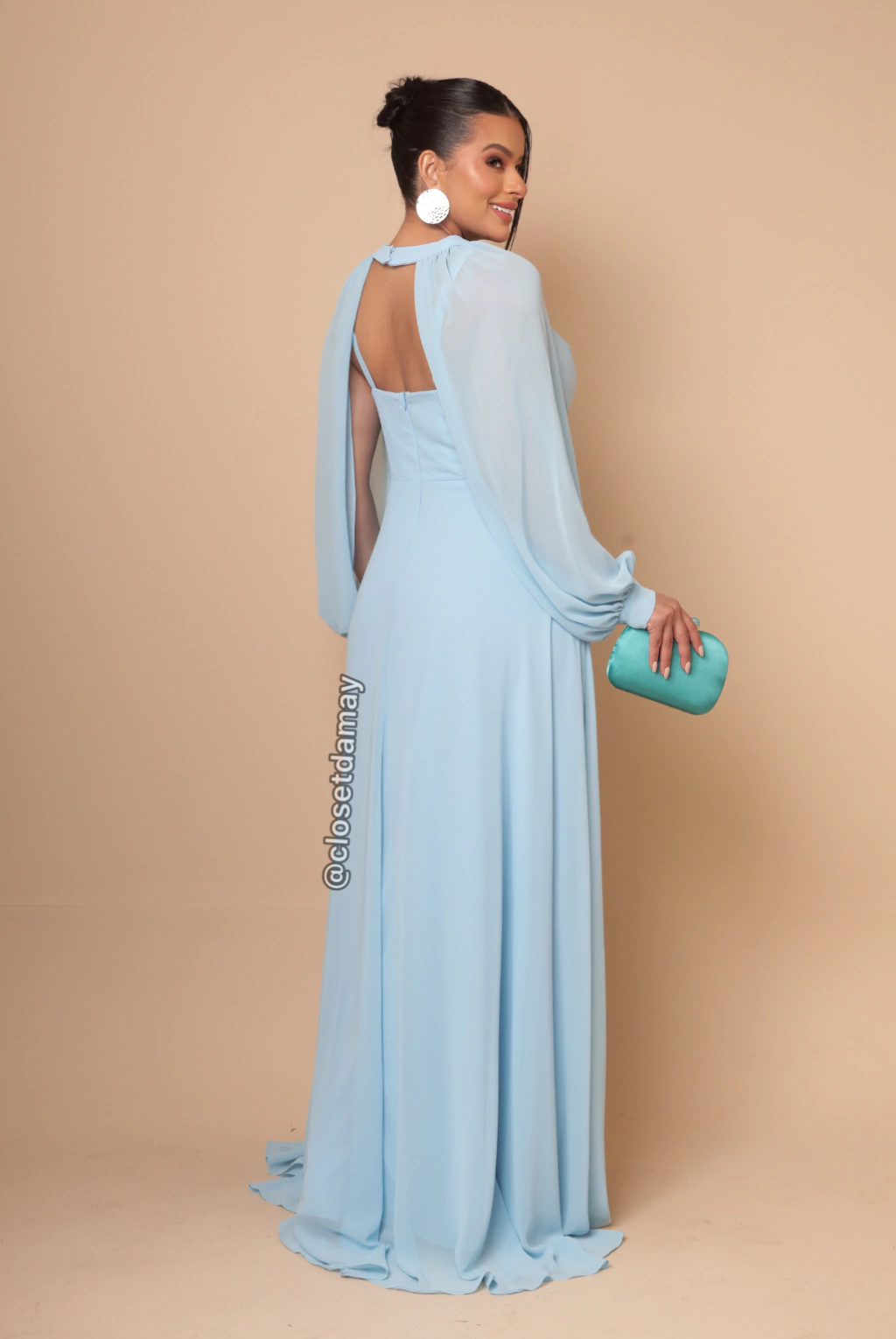 Vestido de festa longo em chiffon, com manga longa removível e saia fluida. Possui bojo, forro e zíper.