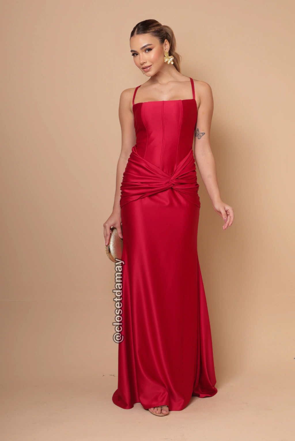 Vestido de festa longo, busto de corset, decote reto, alças finas, flúido, drapeado com nó na cintura.