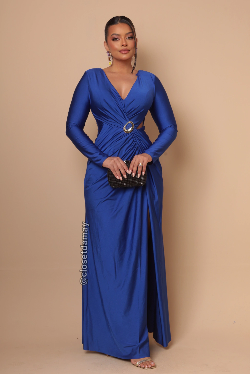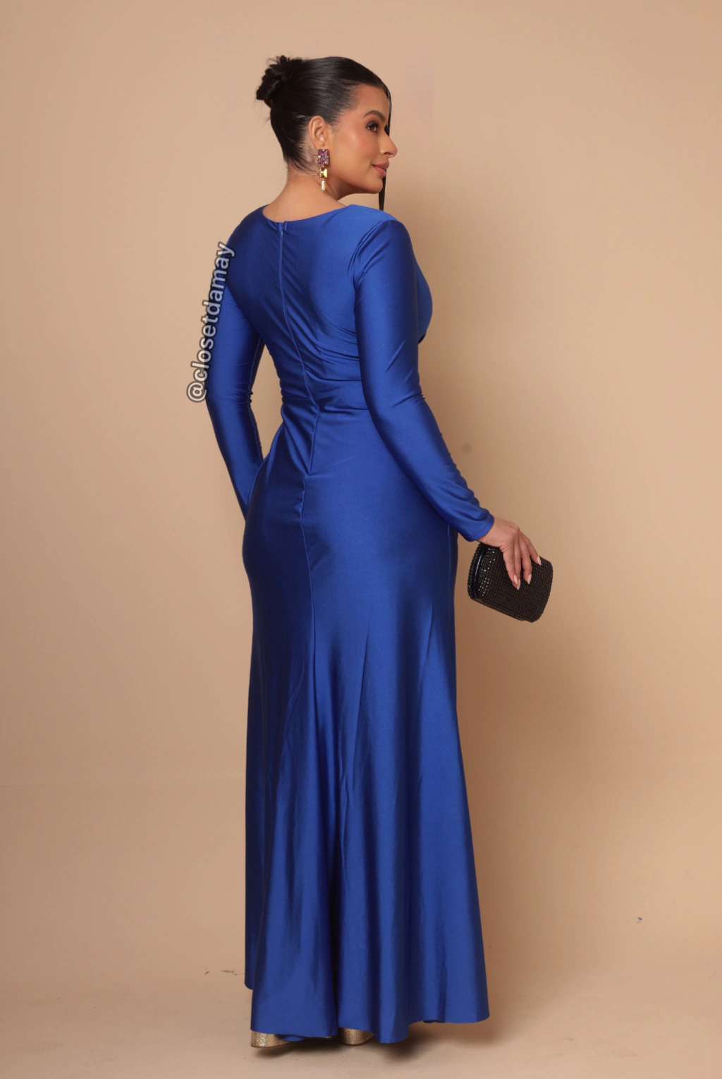 Vestido de festa longo, em jersey, com decote V, fenda, mangas longas e recorte na cintura. Possui zíper e bojo.
