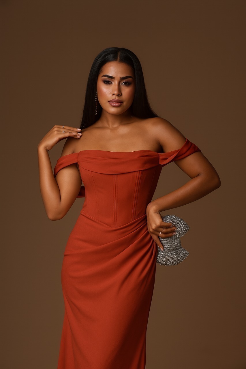 Vestido de festa longo, em crepe com elastano, ombro a ombro, corset estruturado no busto. Possui bojo, forro e zíper.