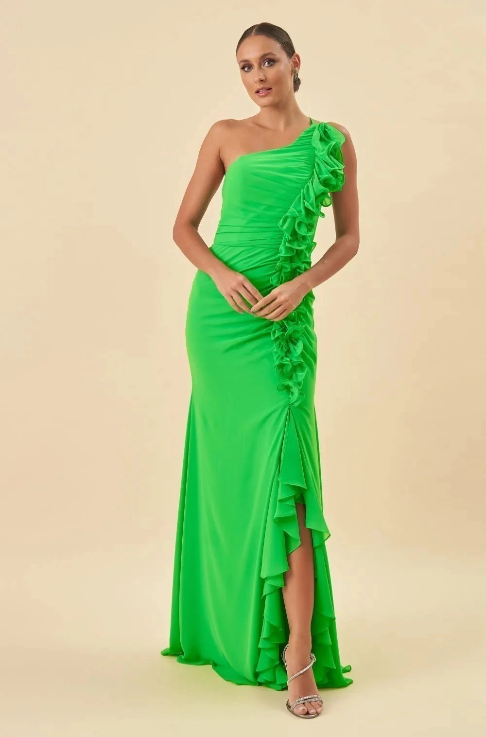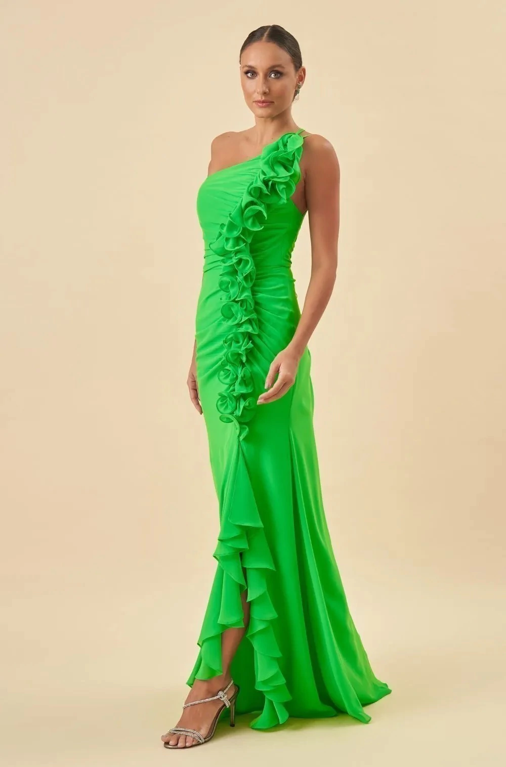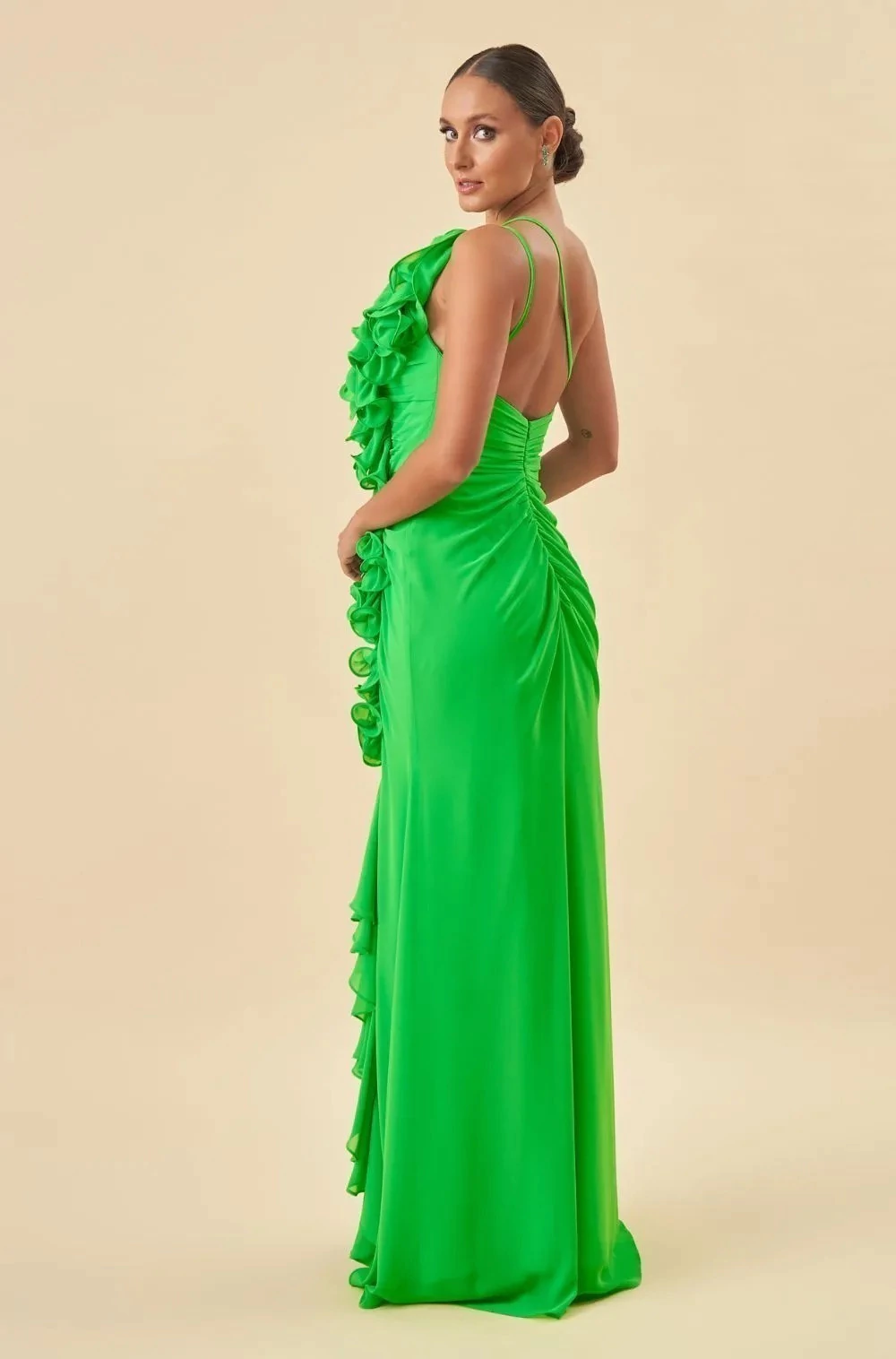 Vestido de festa longo, em chiffon, decote assimétrico, com alças finas, babados em cascata, costas nuas, saia sereia, com fenda e frazido até o quadril. Possui bojo e zíper.