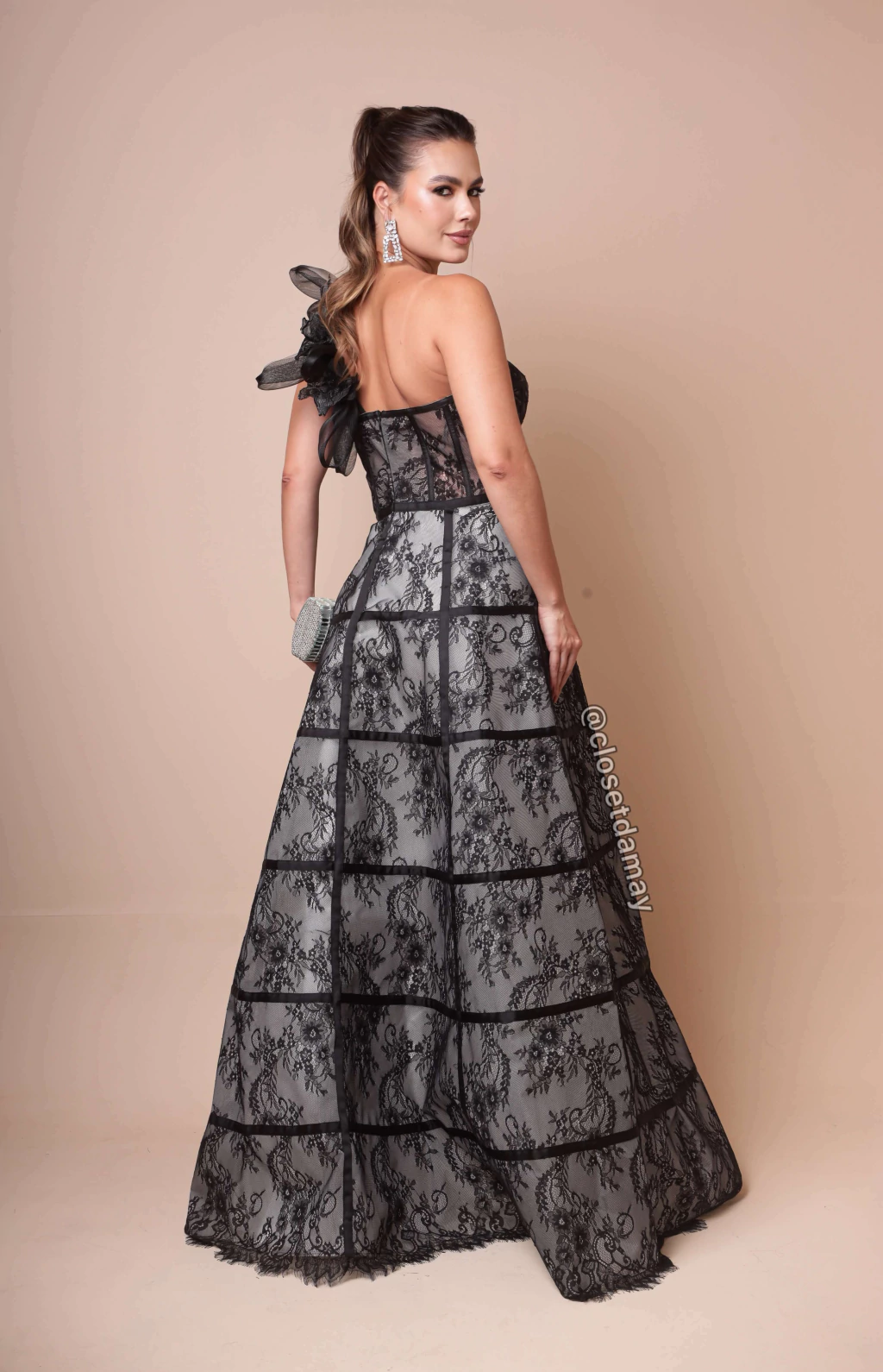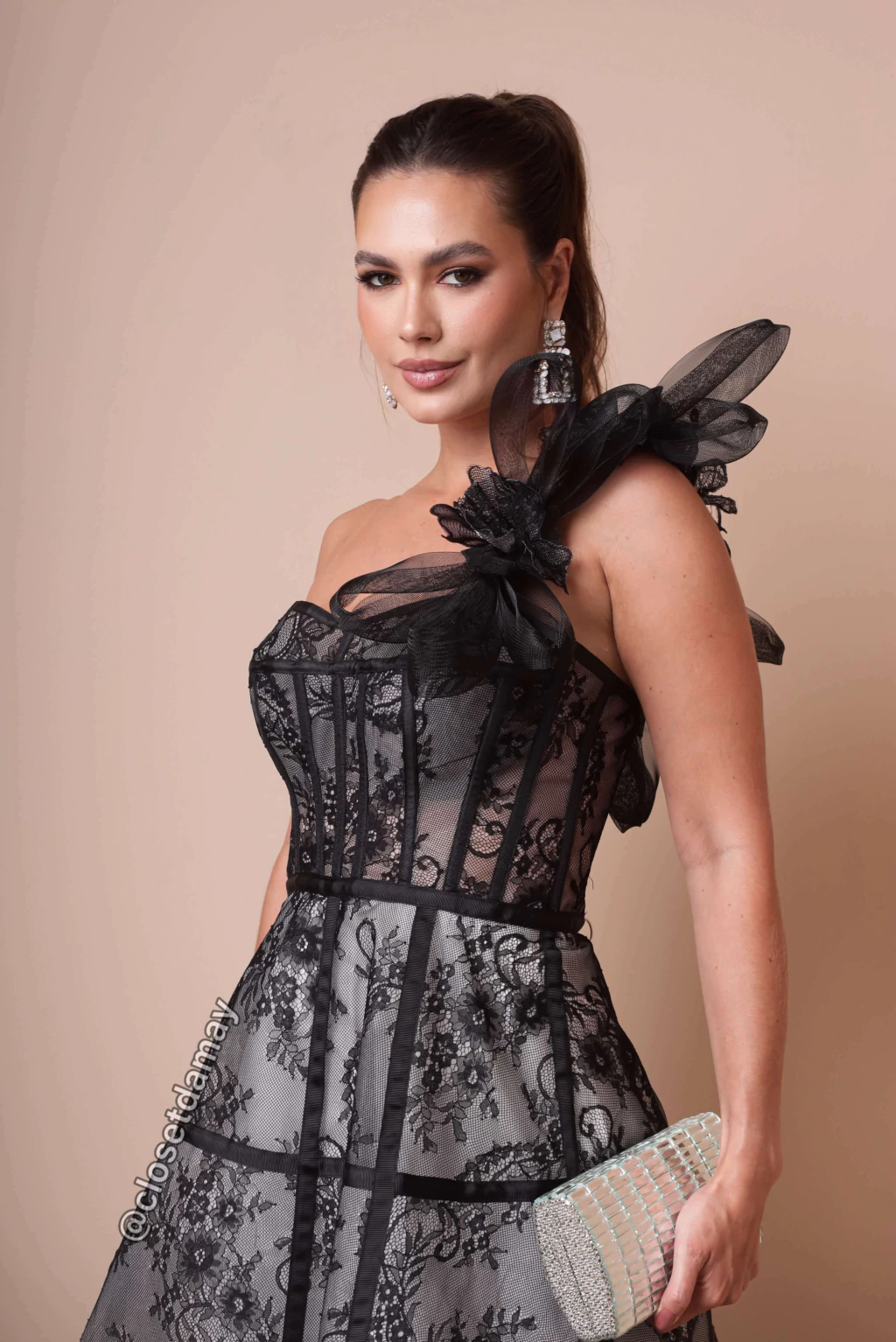 Vestido de festa longo, com decote assimétrico destacando o maxi detalhe de flor escultural de crinol no ombro. Peça com busto corpete, tecido em renda e acabamento em crinol.