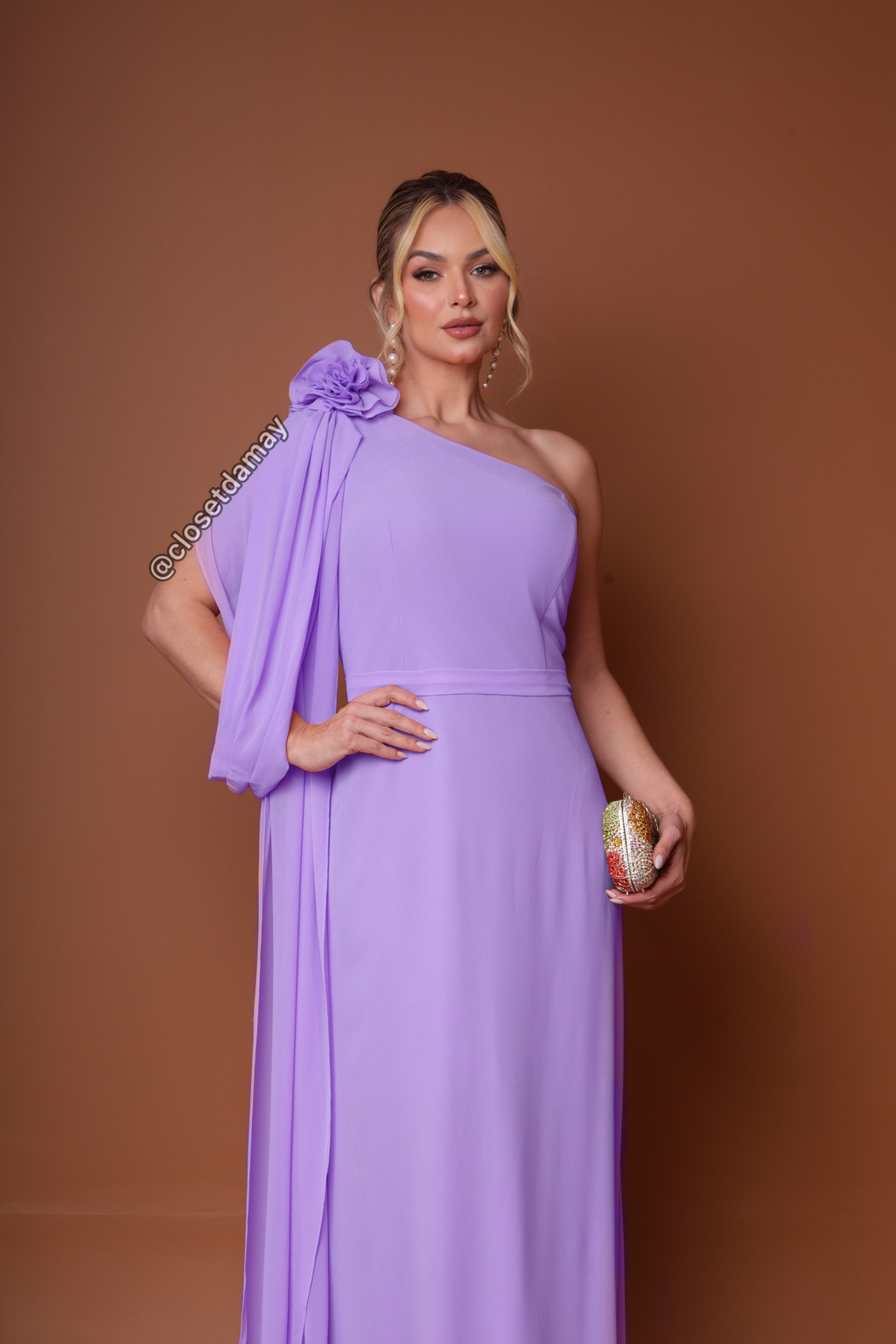 Vestido de festa longo, detalhe de flor e transpassado na cor lilás