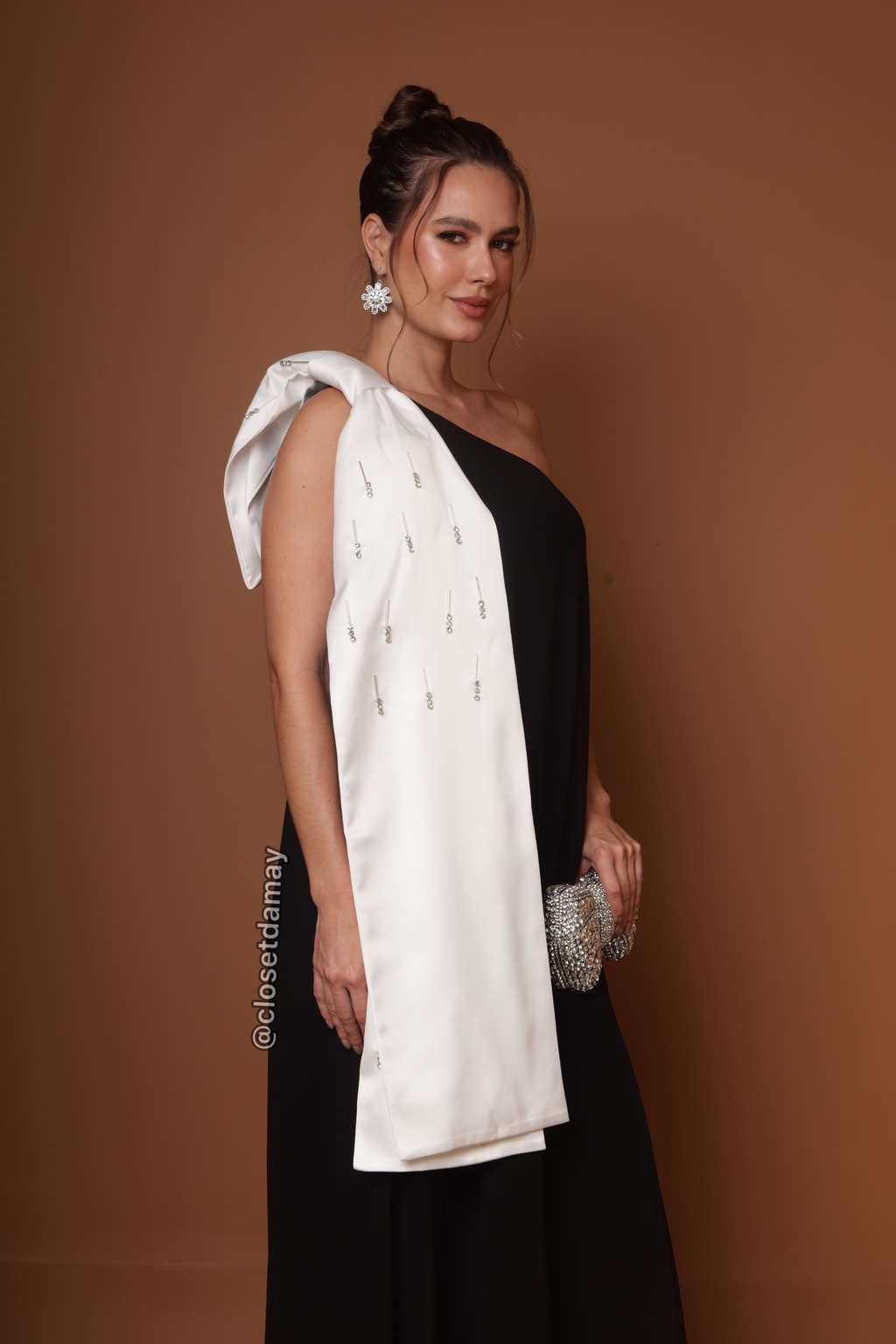 Vestido de festa longo e elegante, confeccionado em chiffon fluido para um caimento leve e sofisticado. O modelo reto valoriza a silhueta, enquanto o design de um ombro só adiciona um toque moderno. O destaque fica por conta do laço grande no ombro oposto, que é removível, permitindo versatilidade no look. Ideal para ocasiões especiais que pedem sofisticação e estilo.