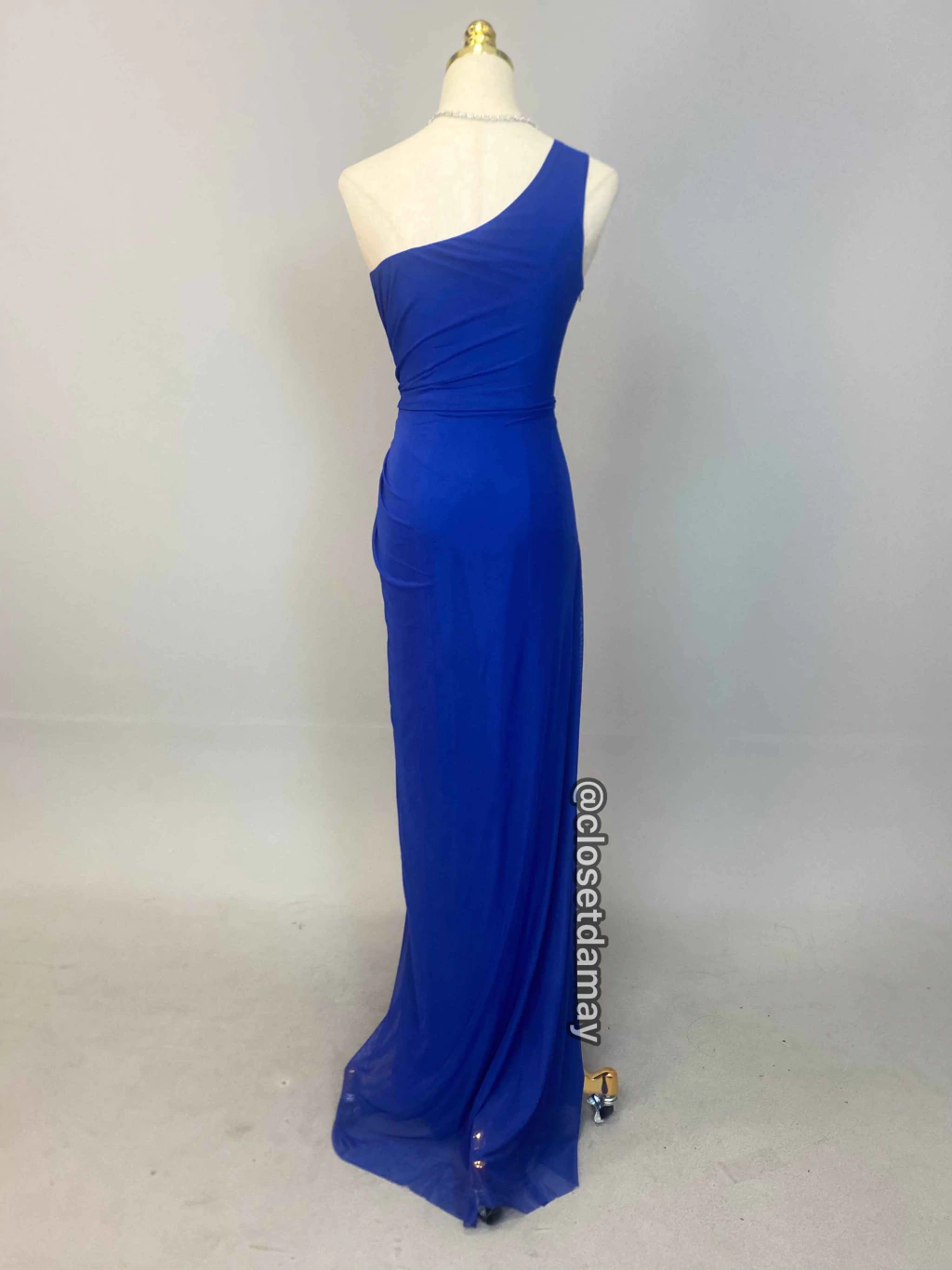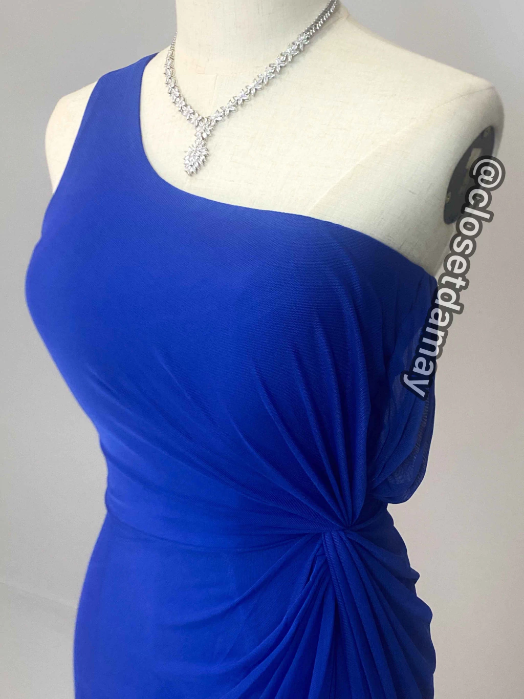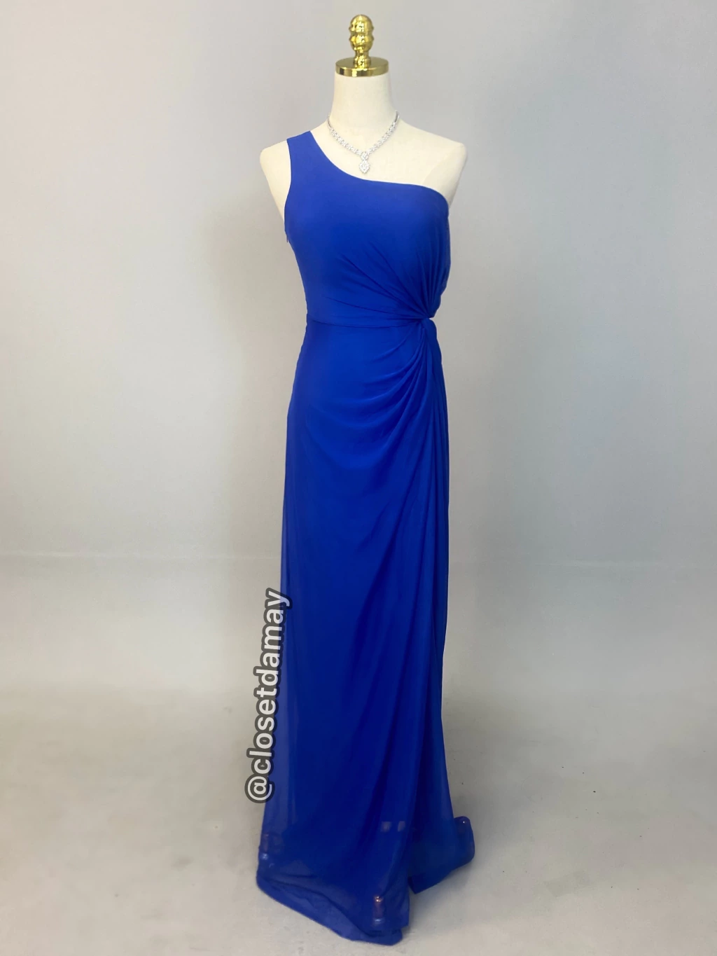 Vestido de festa longo, em tule com elastano, decote assimétrico, com nó fake na lateral da cintura e fenda, . Possui bojo e zíper.