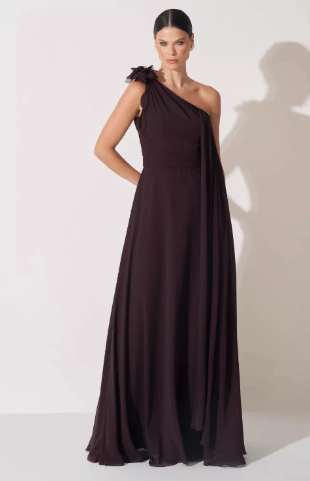 Vestido de festa longo em crepe, decote assimétrico, drapeado e com um detalhe de flor na cintura que garante delicadeza a peça.