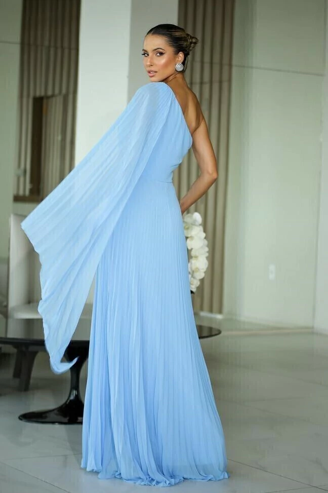 Vestido de festa longo, em crepe de seda plissado, decote assimétrico, com leve torcido na cintura e capa. Possui bojo. forro e zíper.