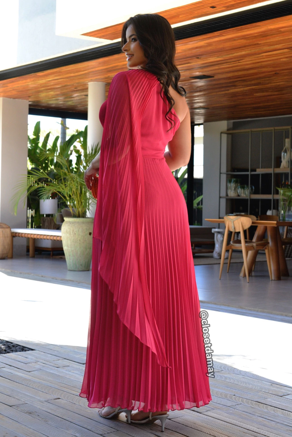 Vestido de festa longo, em crepe de seda plissado, decote assimétrico, com leve torcido na cintura e capa. Possui bojo. forro e zíper.