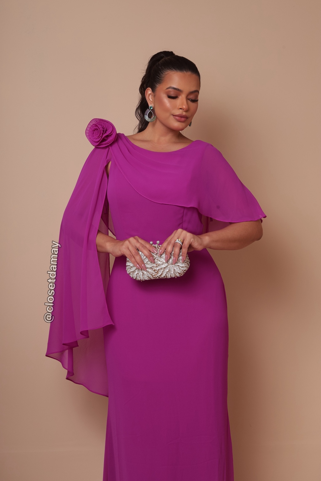 Vestido de festa longo, tecido chiffon, decote canoa, capa e aplicação de flor. Possui bojo. forro e zíper.