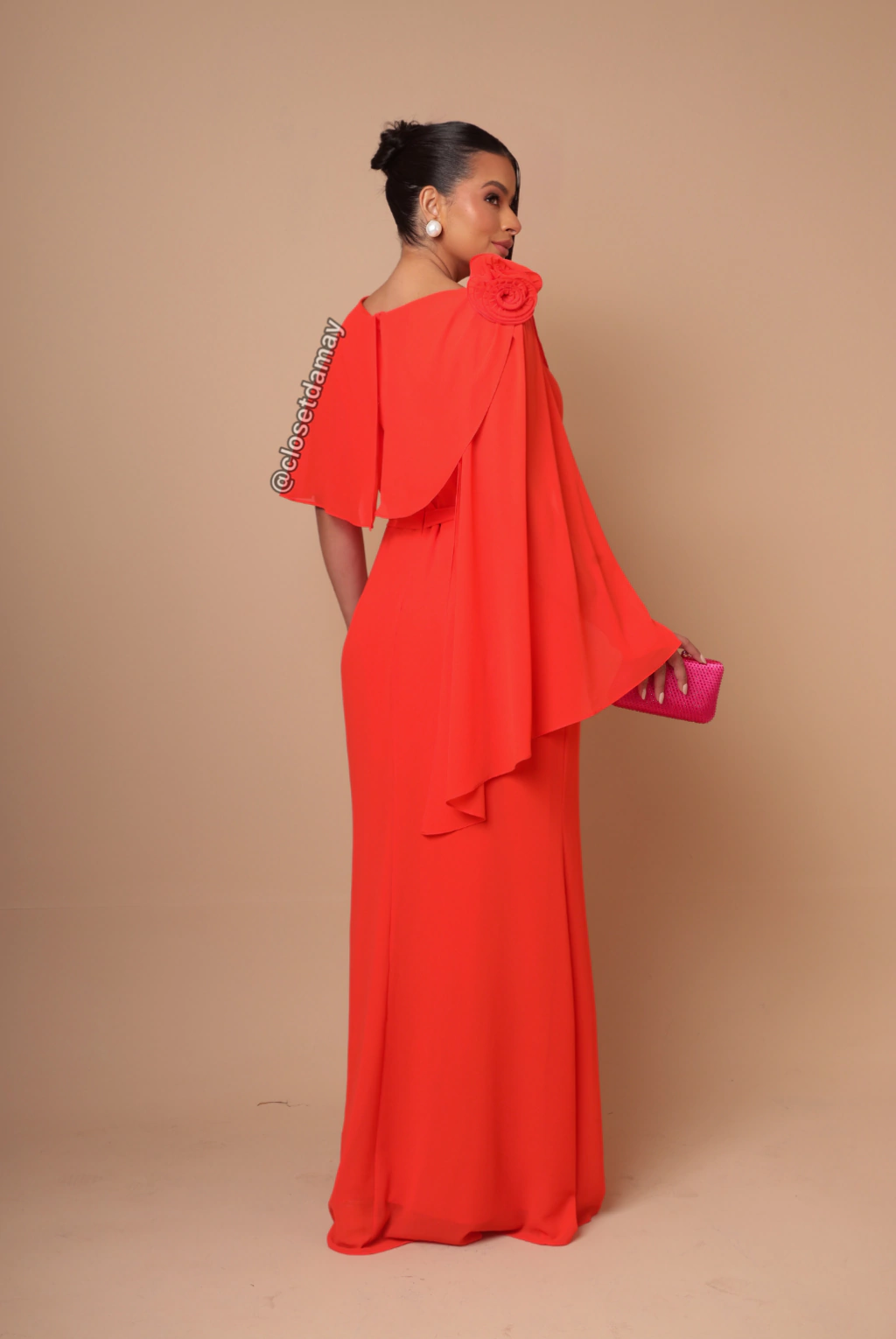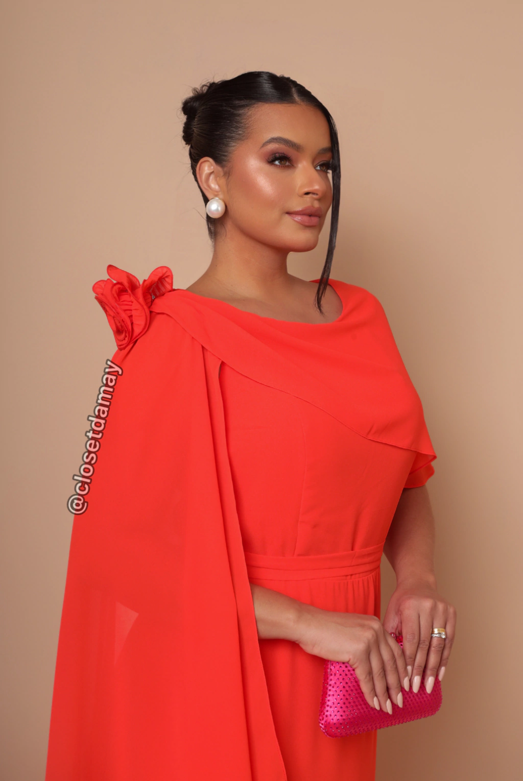 Vestido de festa longo, tecido chiffon, decote canoa, capa e aplicação de flor. Possui bojo. forro e zíper.