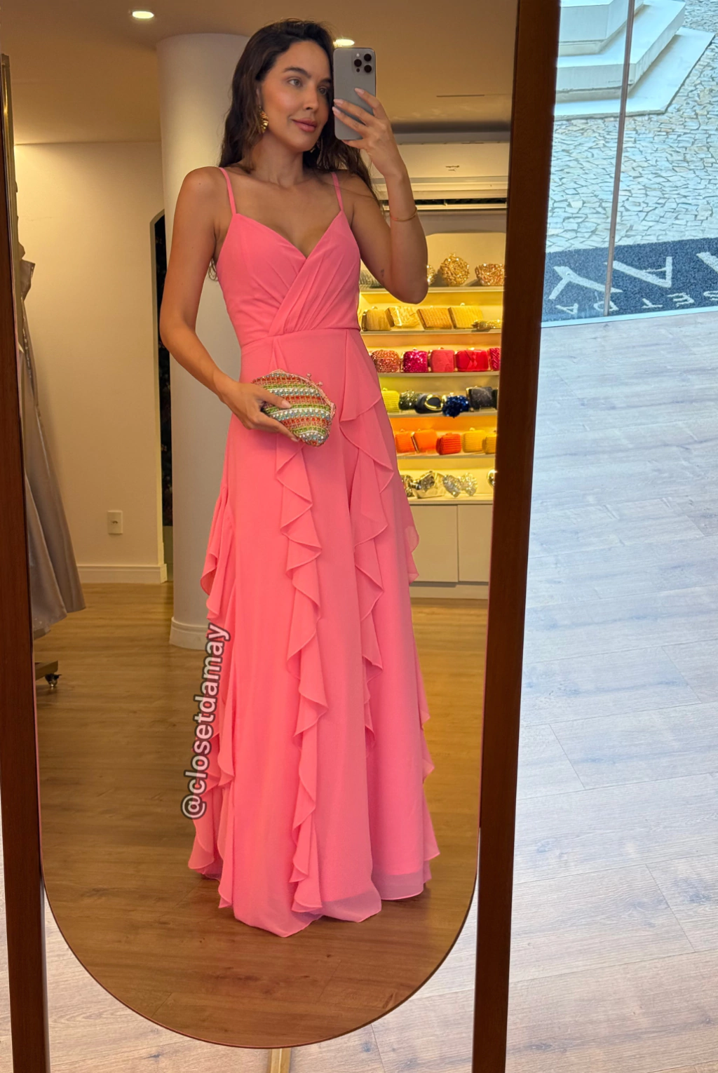 Vestido de festa longo com a saia reta e fluida, com detalhes de babados verticais que deixam o movimento leve e feminino. O decote em V com alças finas realça busto deixando uma ar de delicadeza e elegância