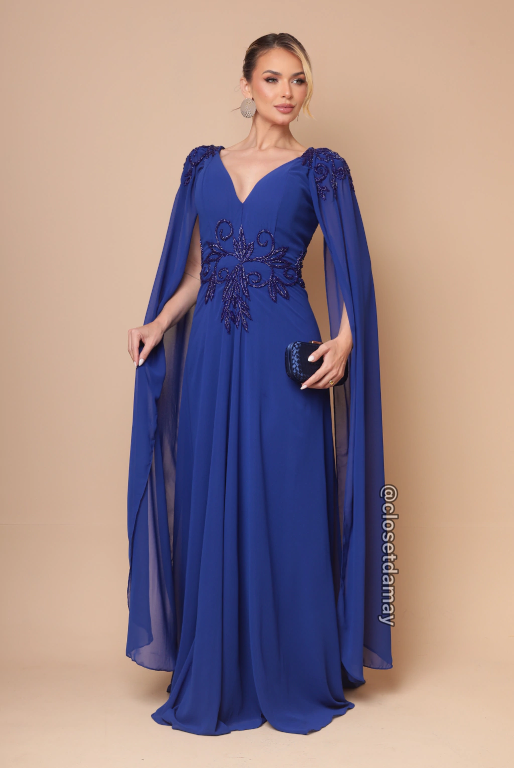 Vestido de festa mangas longas, decote V, com bordado na cintura e nos ombros, saia fluida. Possui bojo, forro e zíper.