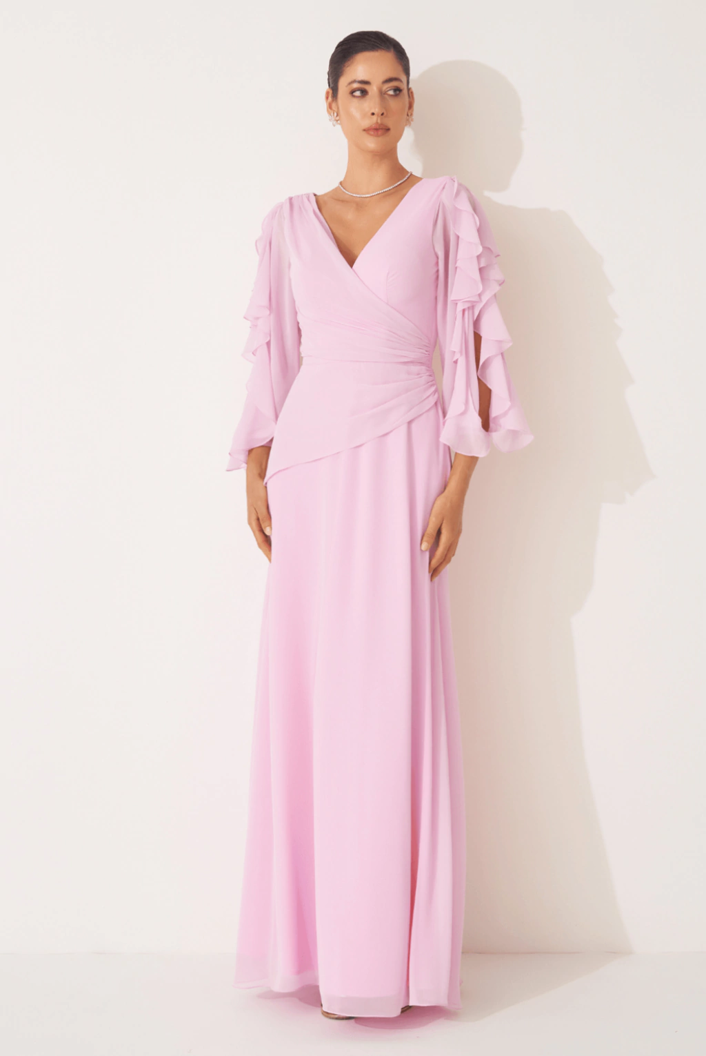 Vestido de festa longo em chiffon, decote em V, drapeado lateral na cintura, manga vazada com babado. Sua construção leve e seus detalhes marcantes criam uma silhueta feminina, elegante e memoráve -