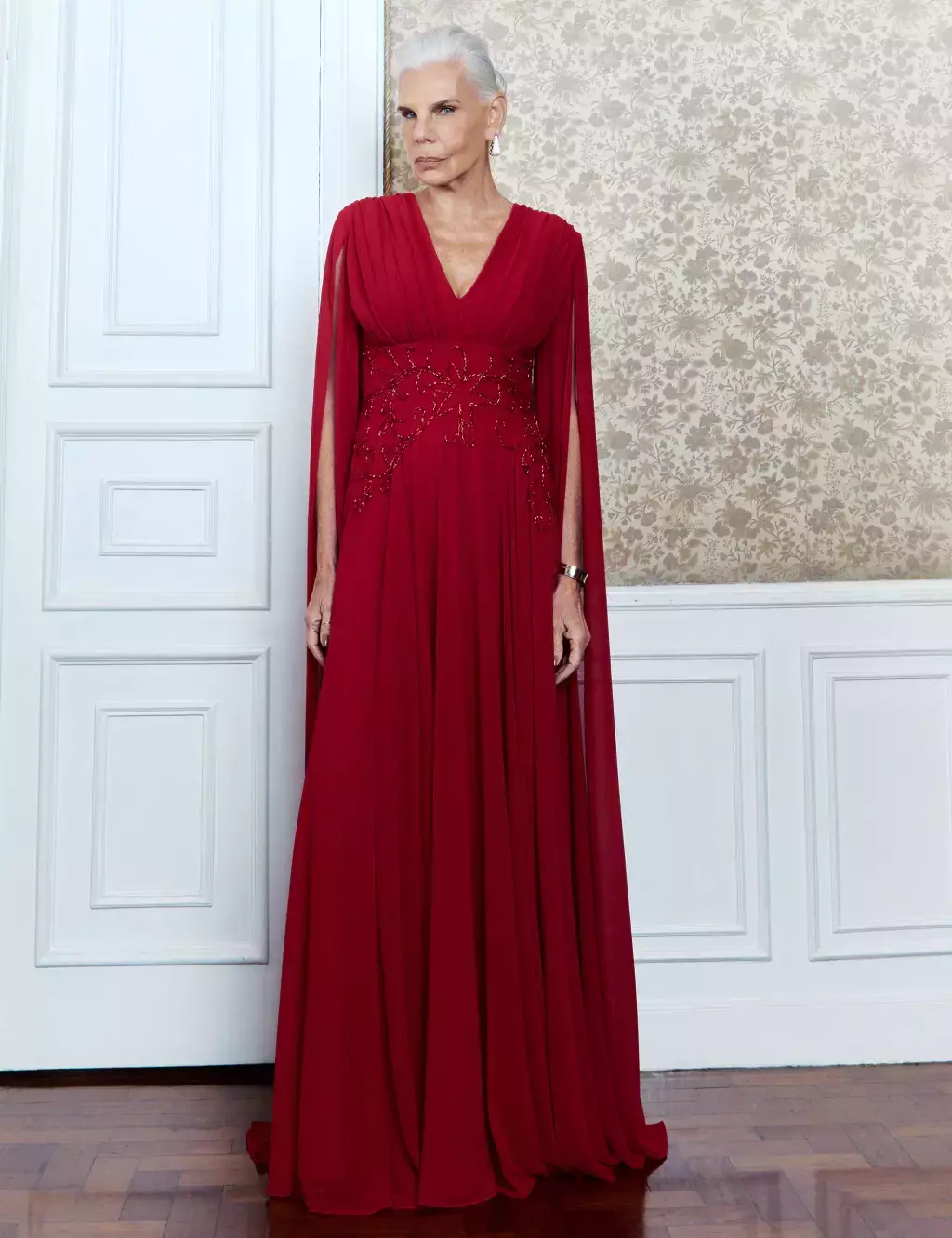 Vestido de festa longo em chiffon, com manga capa, decote em V, busto franzido, saia reta com tecido leve e movimento sutil, decote geométrico nas costas e destaque para faixa bordada na cintura.