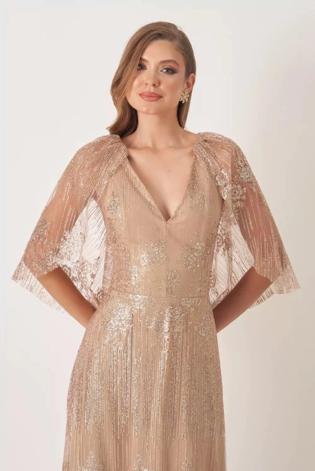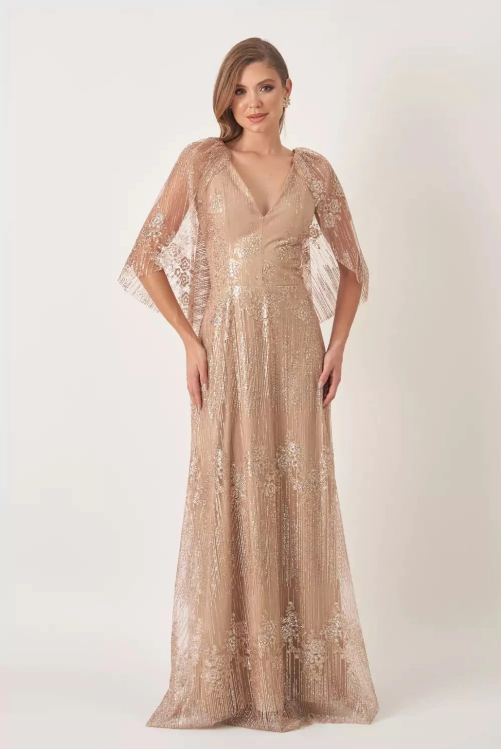 Vestido de festa longo em tule bordado, decote em V, manga capa e bordado - Dourado