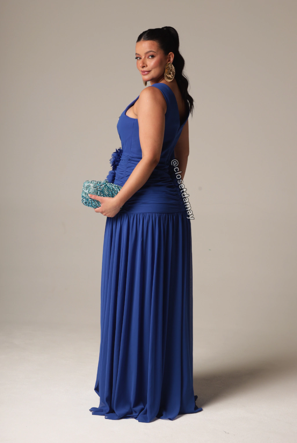 Vestido de festa longo, drapeado com aplicação de flores e fenda - Azul Royal