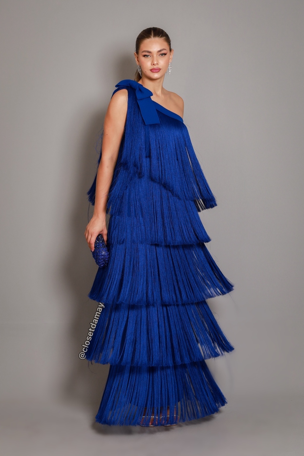 Vestido de festa longo, em tecido acetinado, decote assimétrico com franjas. Possui forro, bojo e zíper invisível.