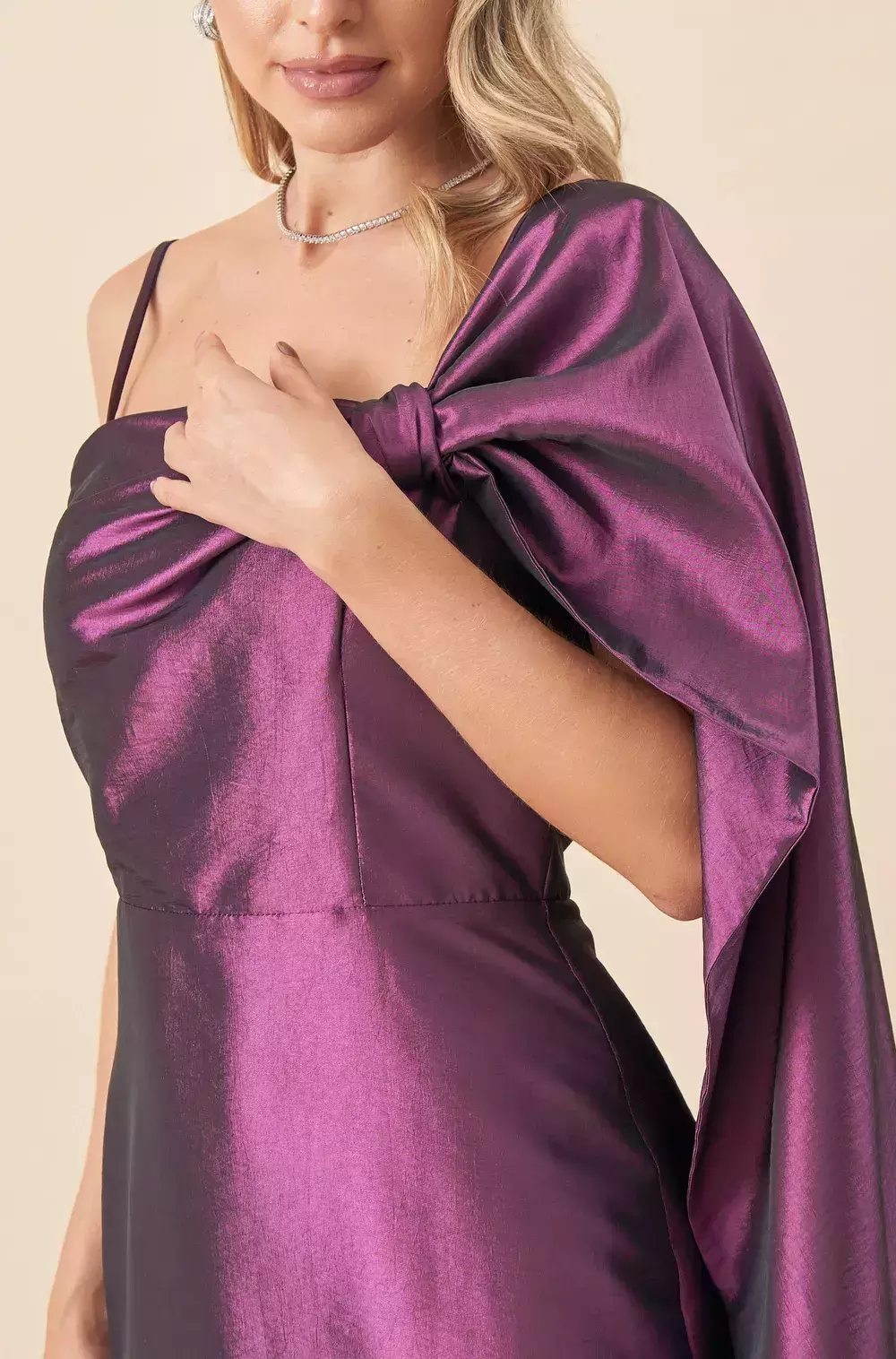 Vestido de festa longo, em zibeline, decote reto, alças finas, com busto drapeado e laço solto. Possui bojo, forro e zíper.
