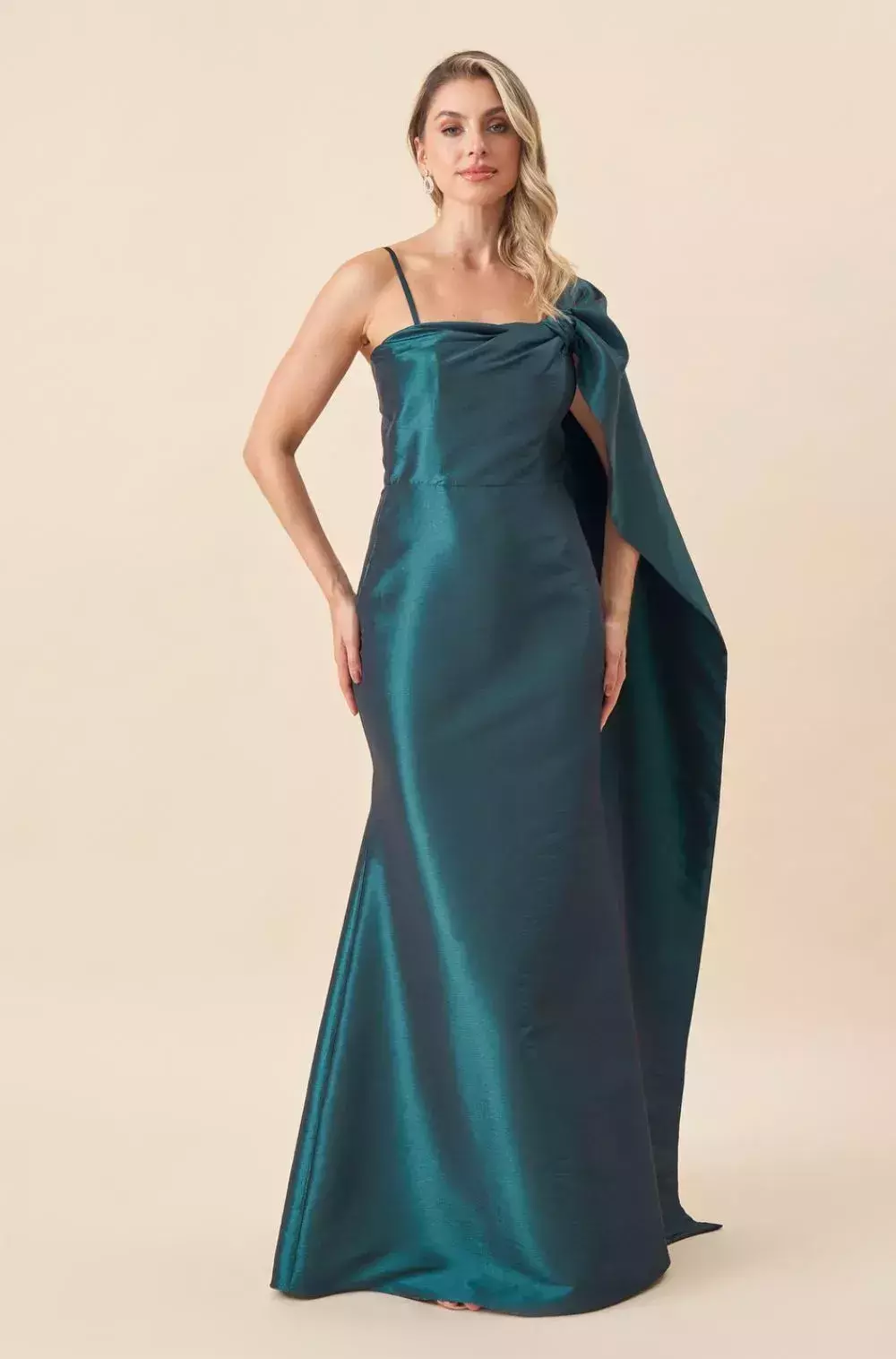 Vestido de festa longo, em zibeline, decote reto, alças finas, com busto drapeado e laço solto. Possui bojo, forro e zíper.