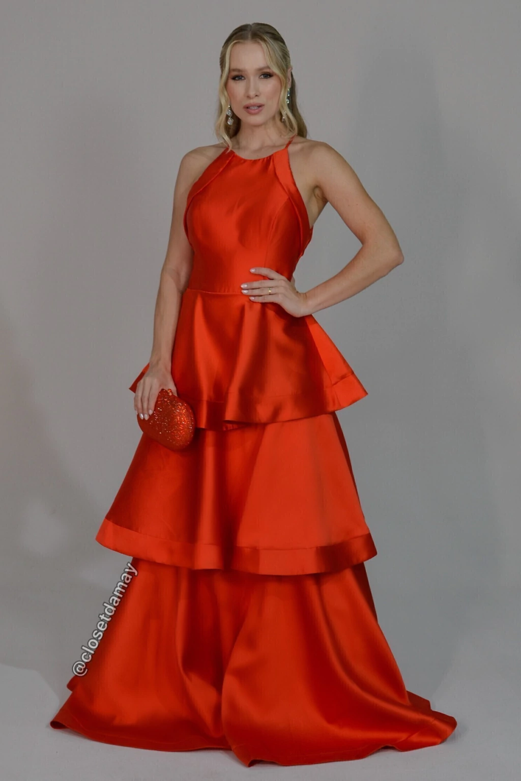 Vestido de festa longo, alças finas, em zibeline, modelagem sereia e saia em camadas.